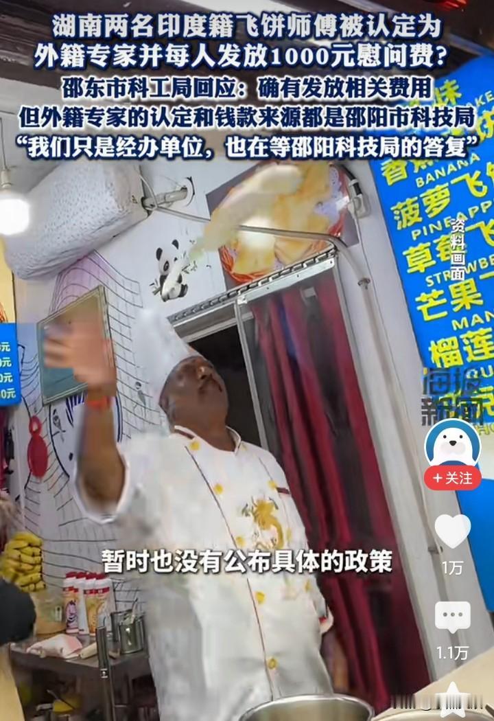 在湖南两个印度人,被认定为飞饼专家,并且发放1000元人民币作为慰问金! 好了