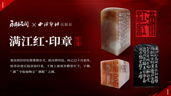 作为联动的开篇,《满江红》篇章特邀西泠印社理事、上海市文史研究馆馆员、知名篆刻家唐存才先生操刀,创作主题印章。该印取秦汉印风之骨,融金石铿锵之韵与江湖侠义之气于一体,这件作品将成为连接两个世界的艺术信物。