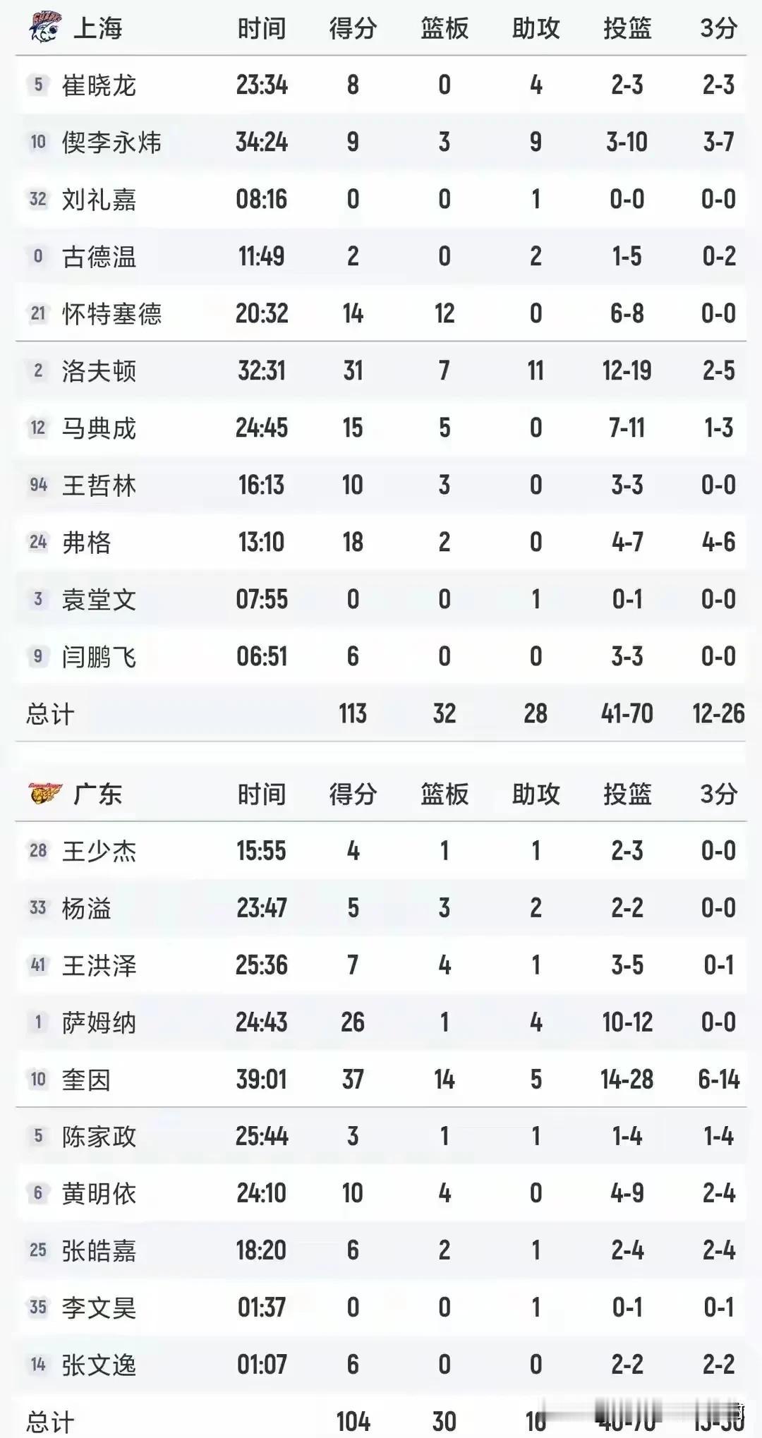 广东男篮104-113第三次输给上海男篮,本场比赛可以有5个总结。 1、广东男篮