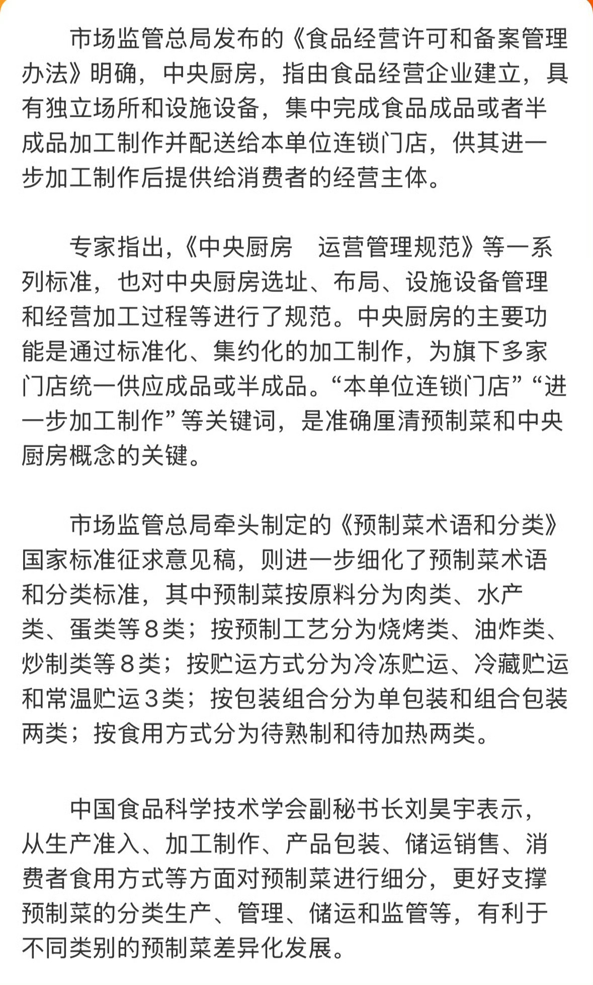 最后,再引用下征求意见稿关于“预制菜”的明确规定,即“以一种或多种食用农产品及其制品为原料,使用或不使用调味料等辅料,不添加防腐剂,经工业化预加工制成,配以或不配以调味料包,加热或熟制后方可食用的预包装菜肴产品。”