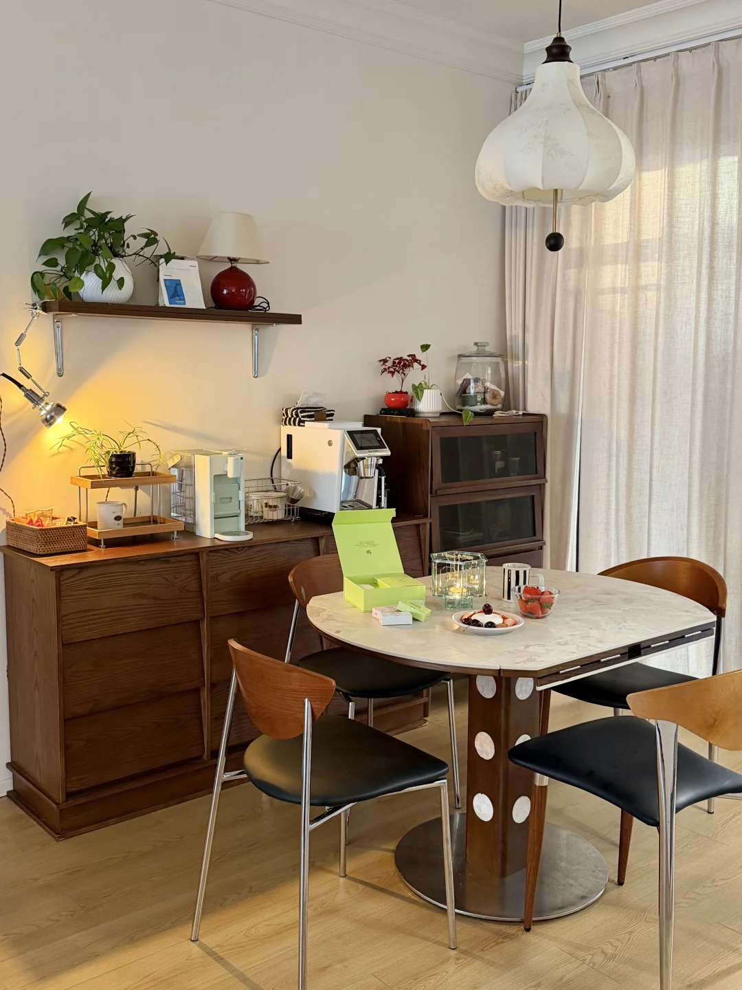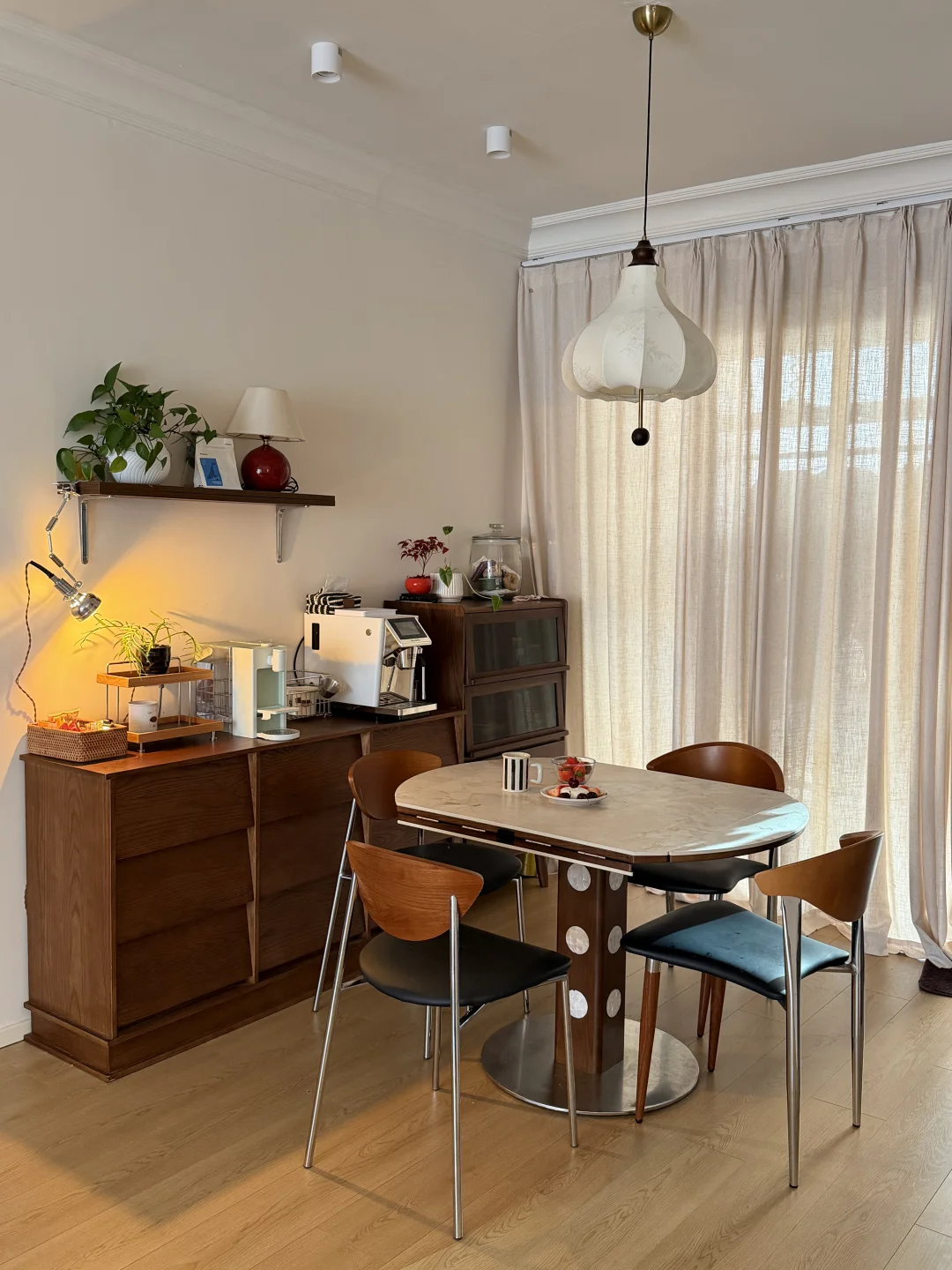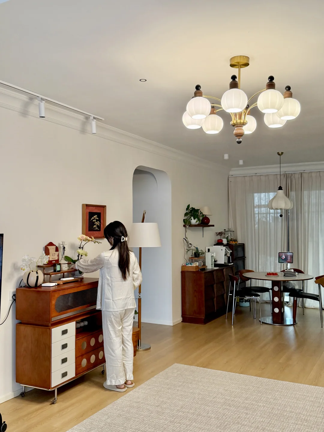 胡桃木与砂镍色的温柔碰撞,和家里通铺的木地板、胡桃木木质柜体,简直是天作之合!奶白灯罩温润有质感,无论是奶油风还是中古风它都完全能hold住,白天不开灯时,纤细优雅的竹节线条静静悬着,不张扬不笨重,妥妥的客厅“颜值担当”