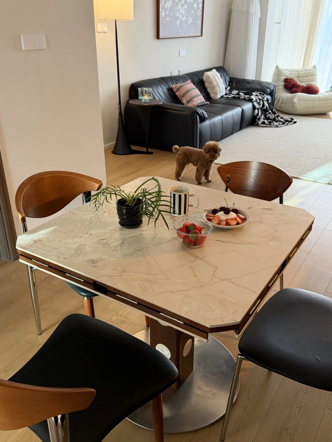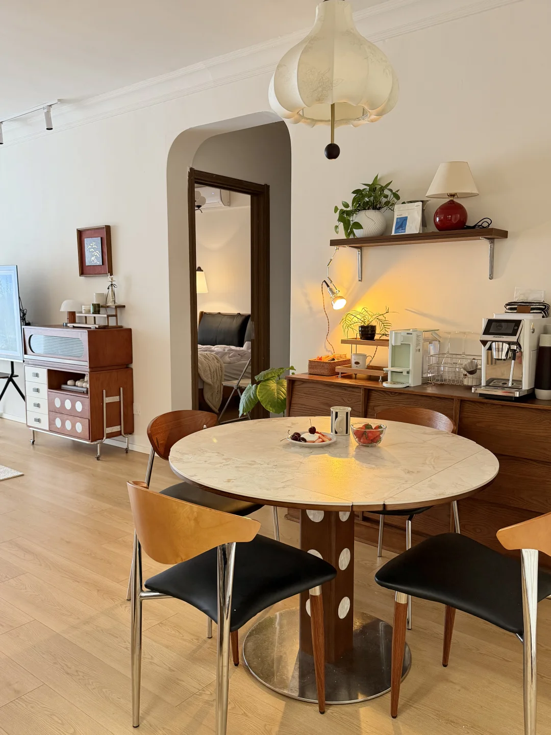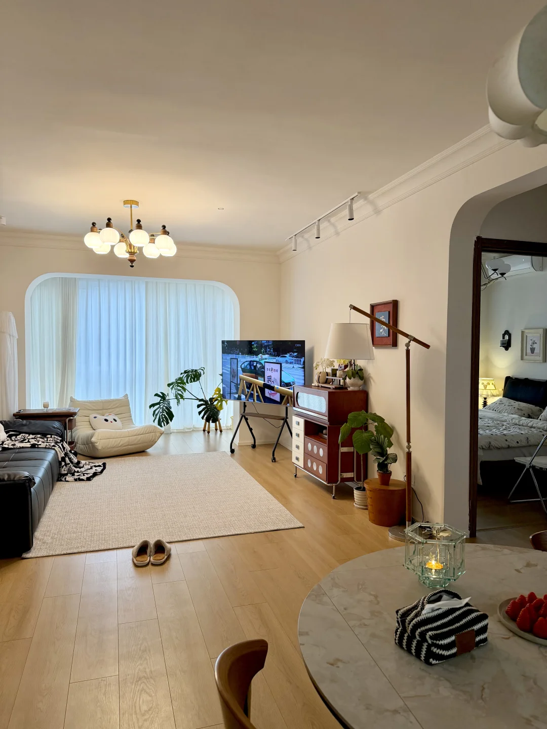 胡桃木与砂镍色的温柔碰撞,和家里通铺的木地板、胡桃木木质柜体,简直是天作之合!奶白灯罩温润有质感,无论是奶油风还是中古风它都完全能hold住,白天不开灯时,纤细优雅的竹节线条静静悬着,不张扬不笨重,妥妥的客厅“颜值担当”