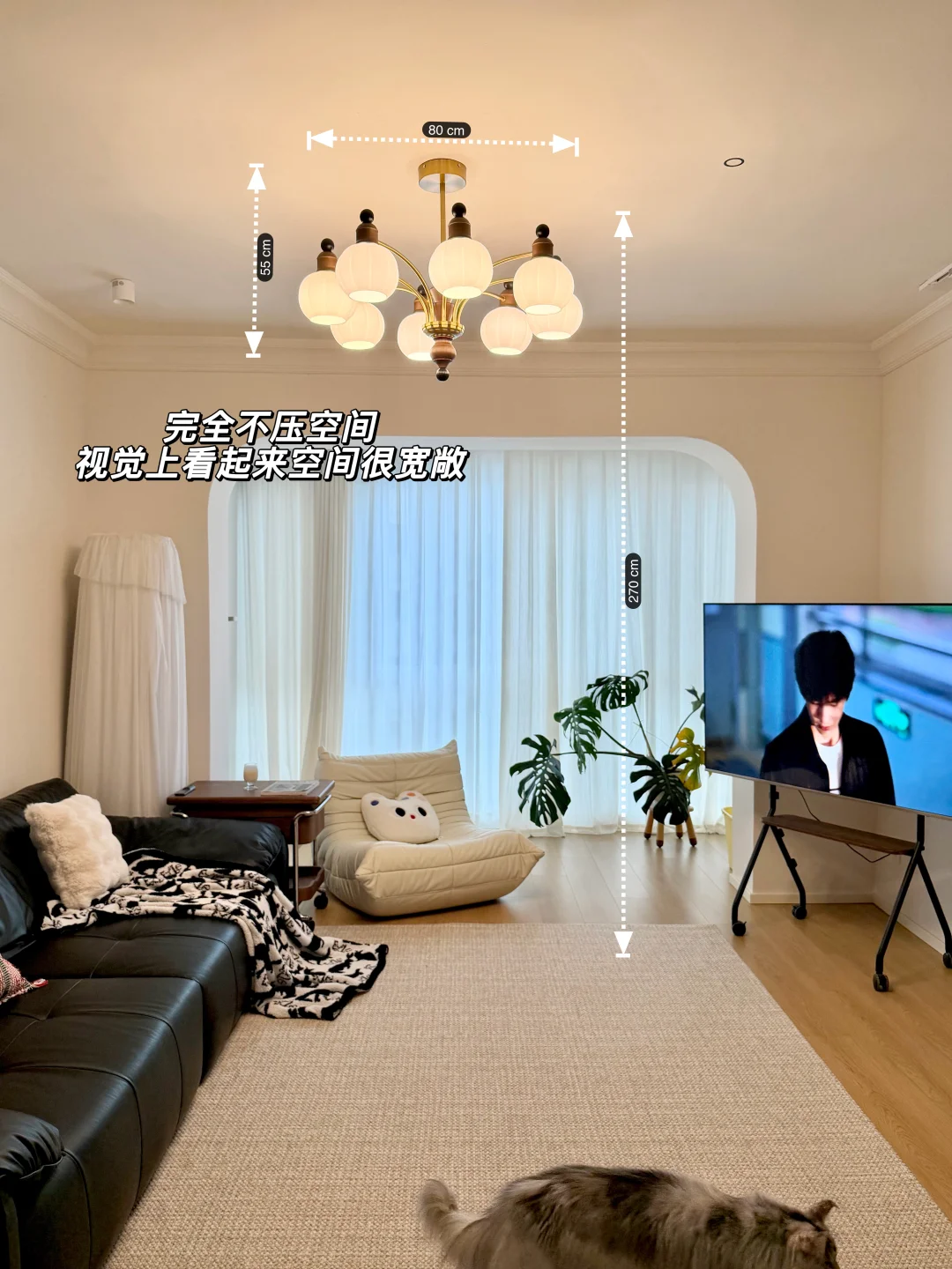 我家是2.7m层高,竹节吊灯的吊高55cm,安装后离地还有2.15米,完全不会觉得压层高,觉得压抑,日常走动、打扫卫生都毫无压迫感,矮层高也能轻松拿捏中古风的韵味,真的太惊喜了~