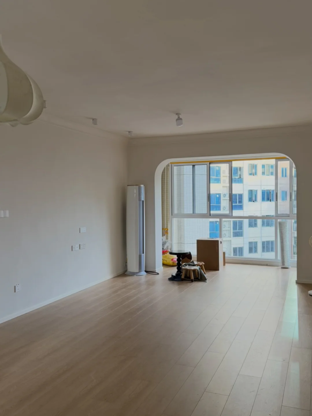 客厅通铺木地板,墙面都是通刷浅色系乳胶漆,