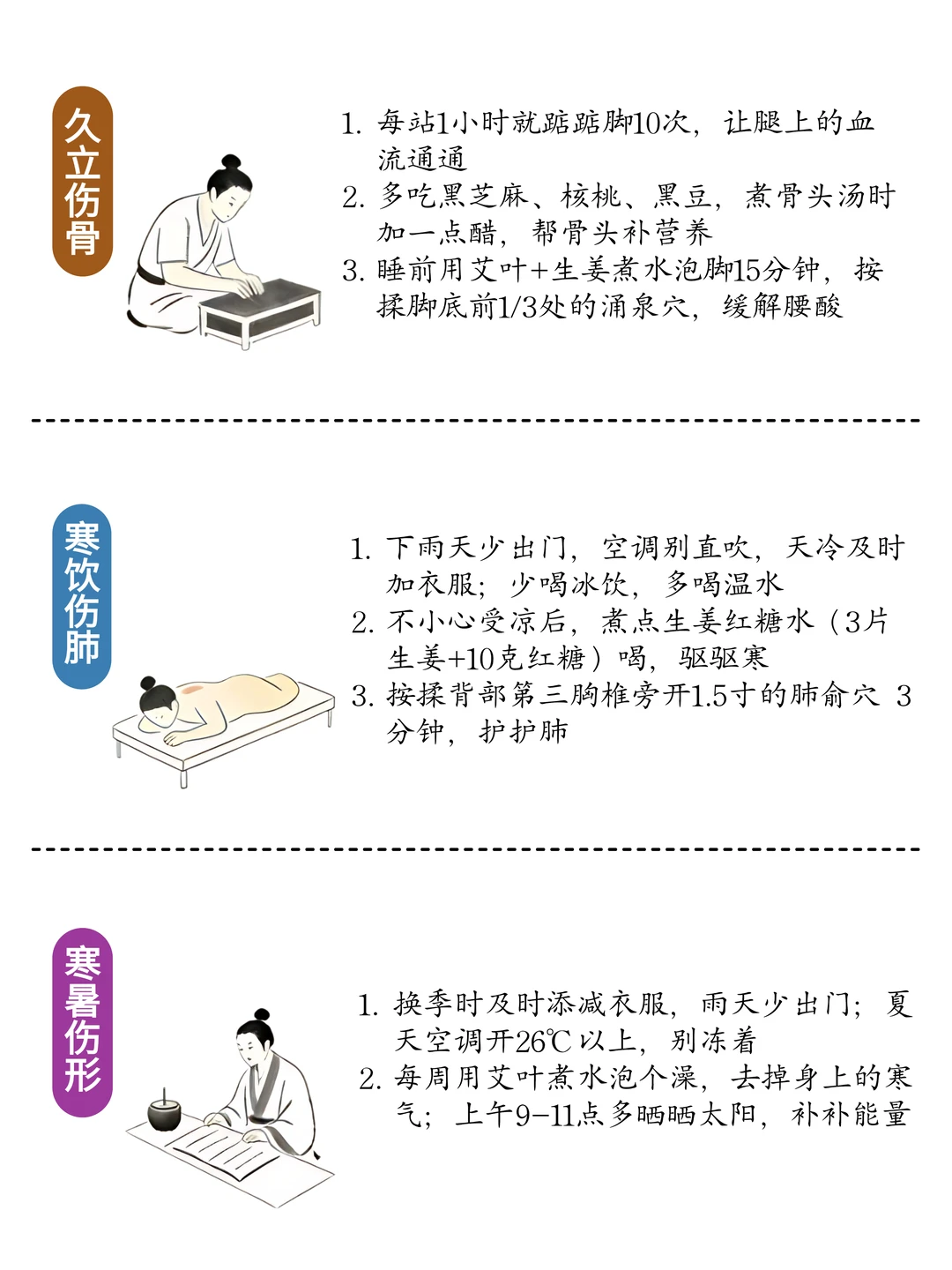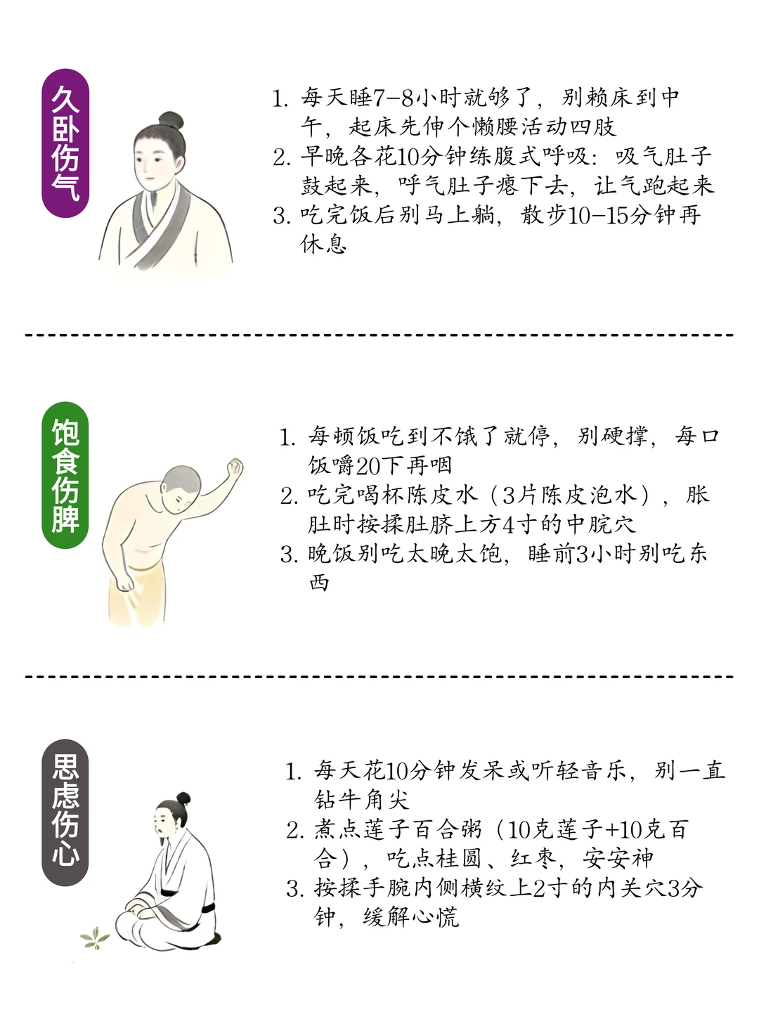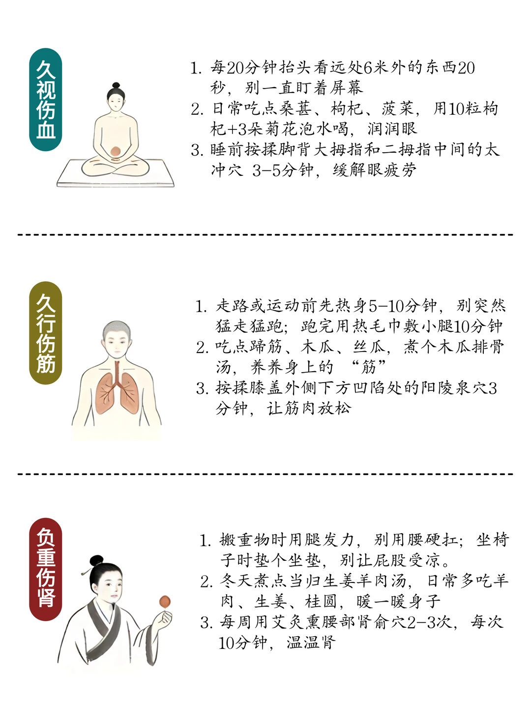 熬夜刷手机、久坐办公、胡吃海喝… 身体的小情绪,其实都藏在“五劳七伤”里! 久视:每30分钟闭眼休息2分钟,按揉睛明穴 久卧:固定起床时间,晨起做深呼吸 久坐:每小时起身走2分钟,拍一拍腹部 久立:睡前泡脚按揉涌泉穴 久行:运动前热身,运动后拉伸小腿 饱食伤脾:吃饭七分饱 暴怒伤肝:生气时先喝口水 寒饮伤肺:天冷少喝冷饮 负重伤肾:搬重物不要逞强 思虑伤心:睡前少想工作 惊恐伤志:听舒缓音乐,晒太阳 寒暑伤形:换季及时增减衣物