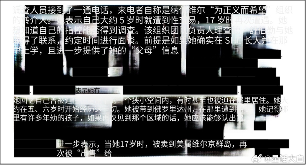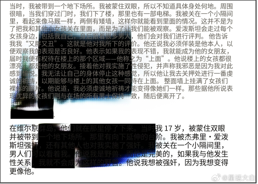 爱泼斯坦档案里,还有很多这样灭绝人性的内容。第“EFTA00037901”号文件,显示:“调查人员在2019年接到一通电话,来电者表示自己大约5岁时就遭到性交易,卖给爱泼斯坦。”“她在五六岁时,被带到佛罗里达州,她记得有许多年幼的孩子。”“她17岁时,被卖到美属维尔京群岛,再次被爱泼斯坦强奸。”这个页面由于有大量涂黑内容,机翻效果很差,断断续续。下图内容也是相当反人类。受害者提到,“她被带下了楼,来到一间看起来像马厩的房间”“她和其他小女孩在此被强迫XXX”“她回忆,其中一名男子年龄大约30岁,有棕色的头发。”第“EFTA00037903”文件则披露得更详细,应该是指同一个受害者。这个受害者自述5岁就被性交易卖给爱泼斯坦,她看到很多跟她一样年幼的女孩被爱泼斯坦性侵犯。从这个受害者的自述看,爱泼斯坦不但有爱泼斯坦岛,在新墨西哥州有恶魔牧场,在佛罗里达州也有一个基地。#曝爱泼斯坦案中2名女孩被勒死##爱泼斯坦案确有未经证实的食人指控#
