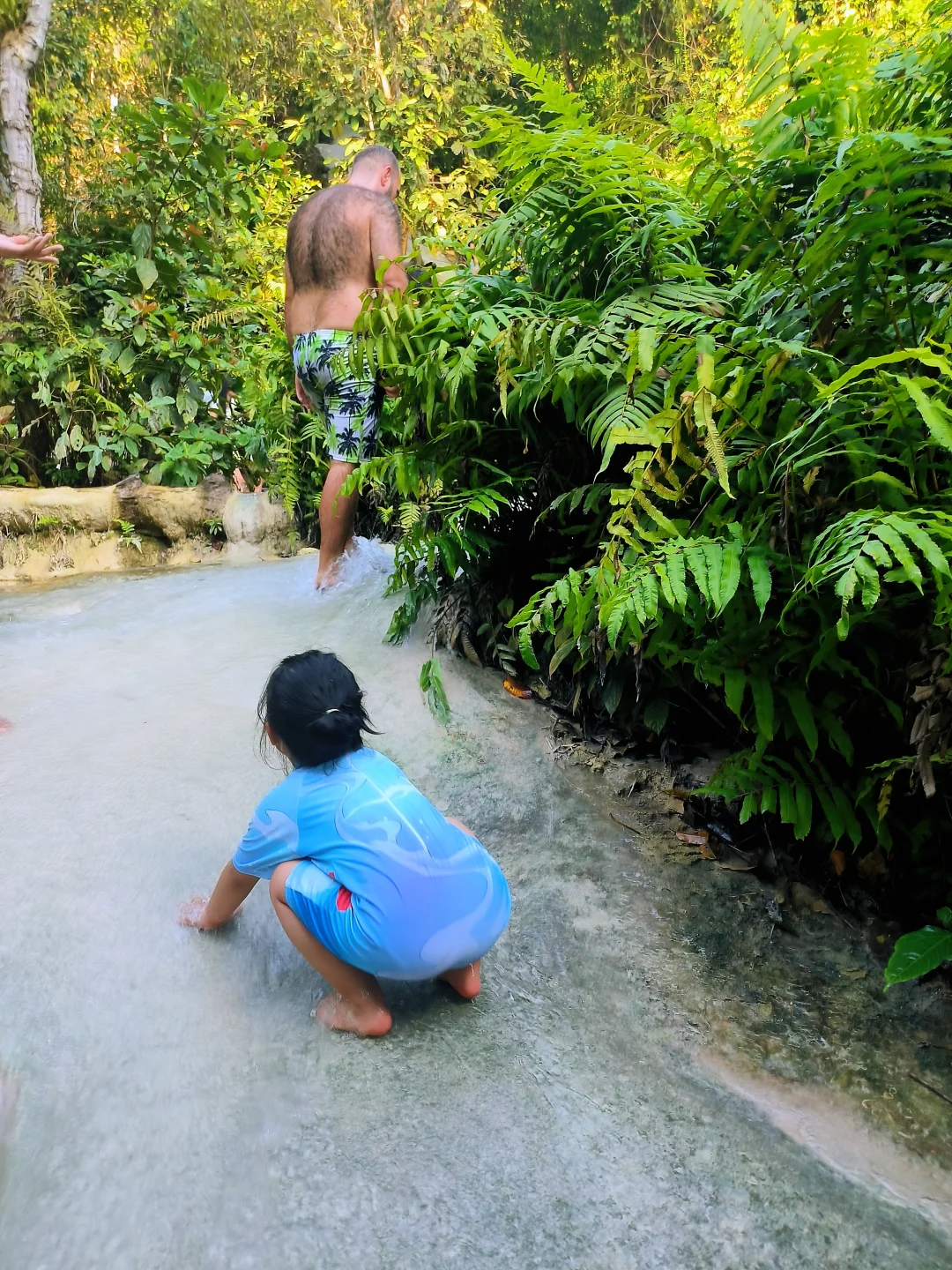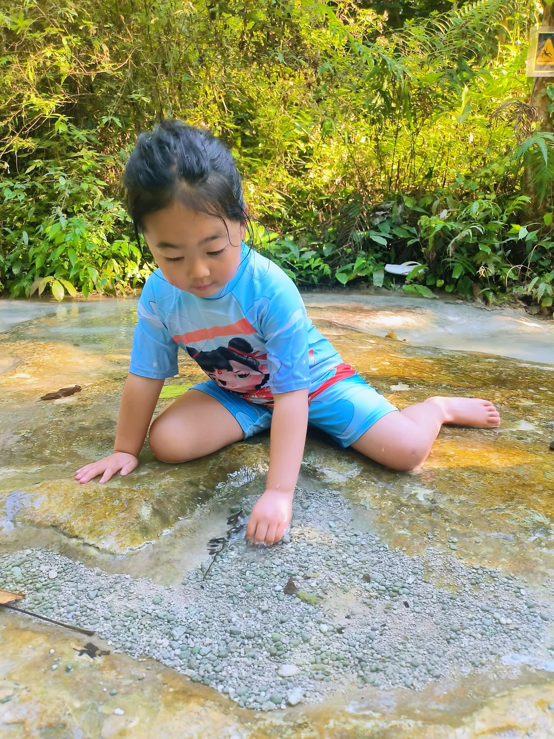 溪流清澈见底,水温清凉不刺骨,娃直接躺水里当“人工滑梯”。