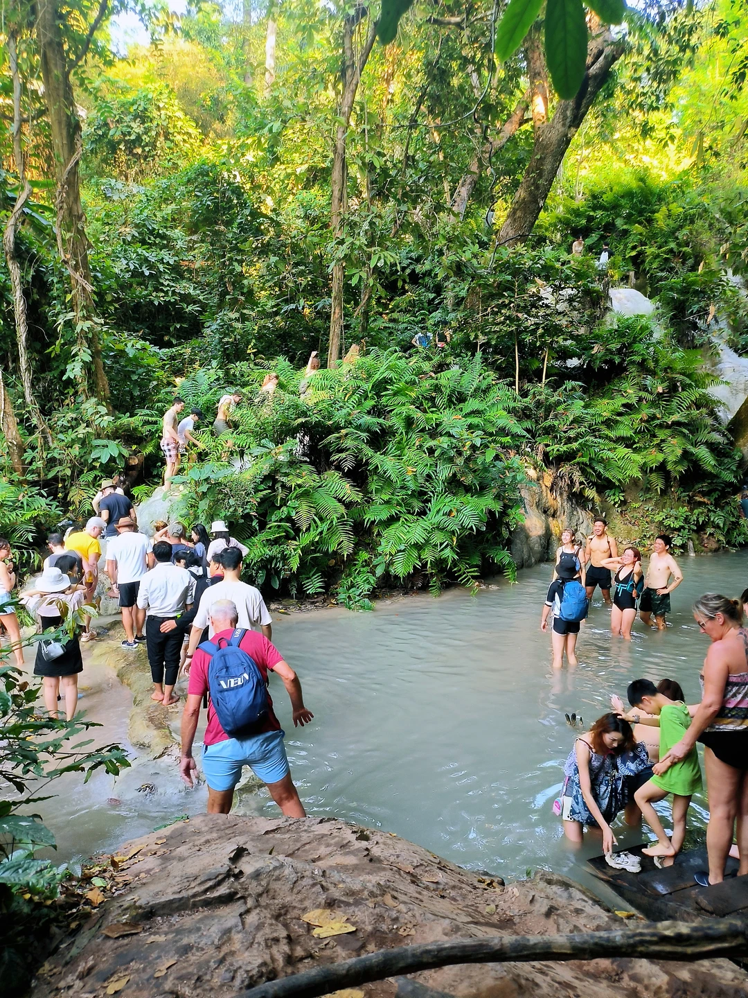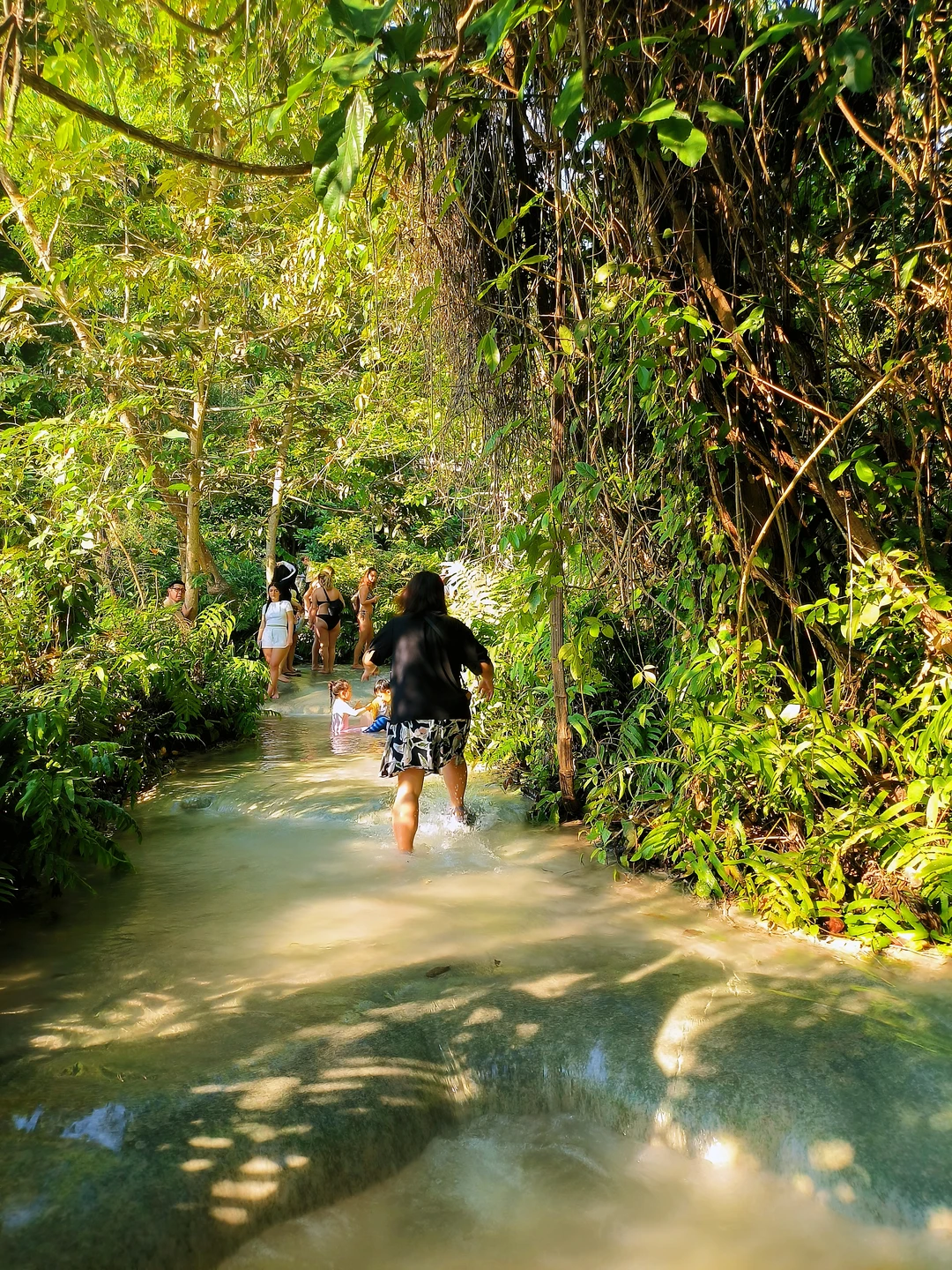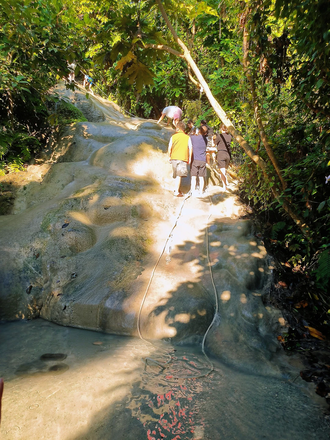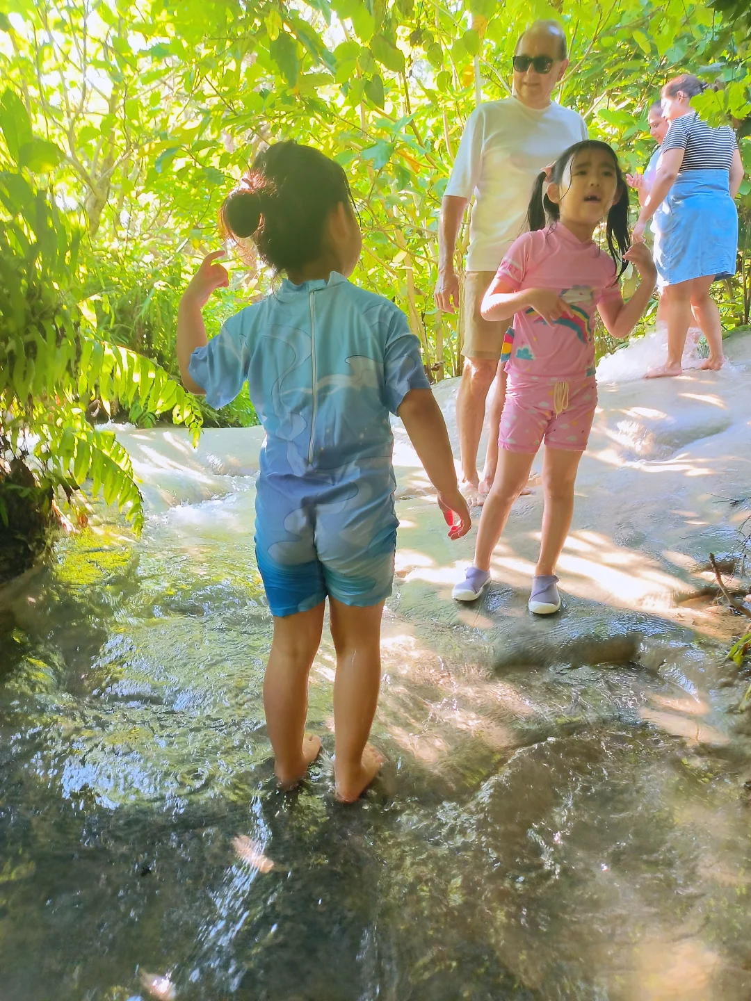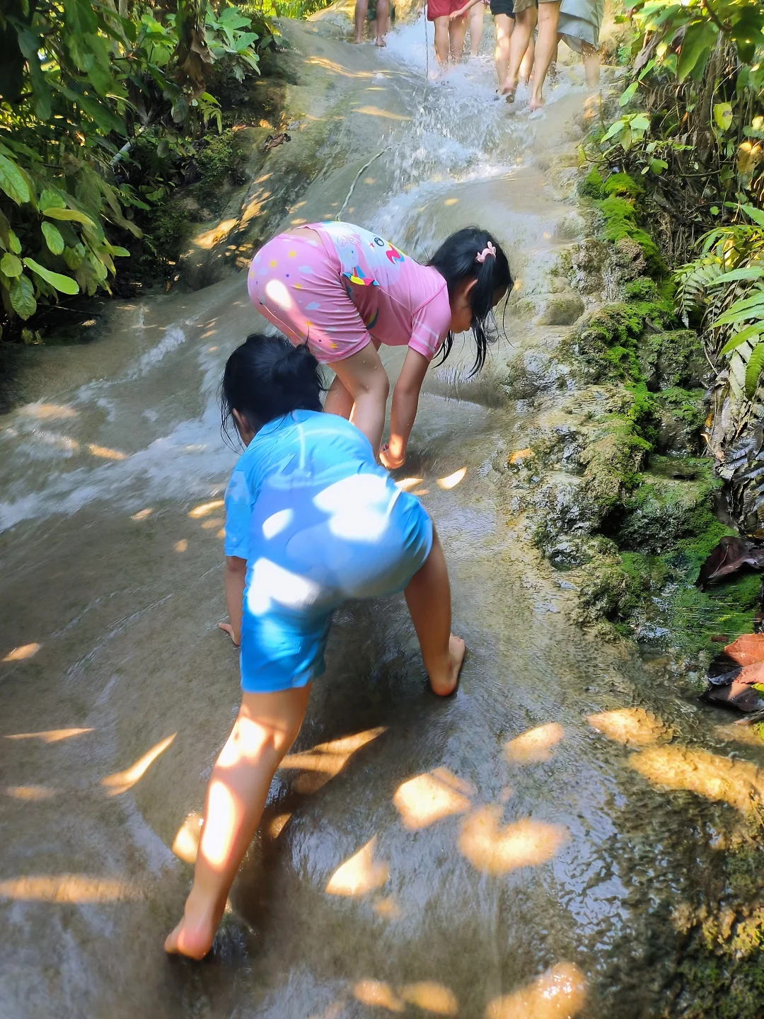 独特体验:因水中碳酸钙沉积,岩石表面粗糙粘脚,娃能徒手攀爬,惊呼“像壁虎飞檐走壁!”。