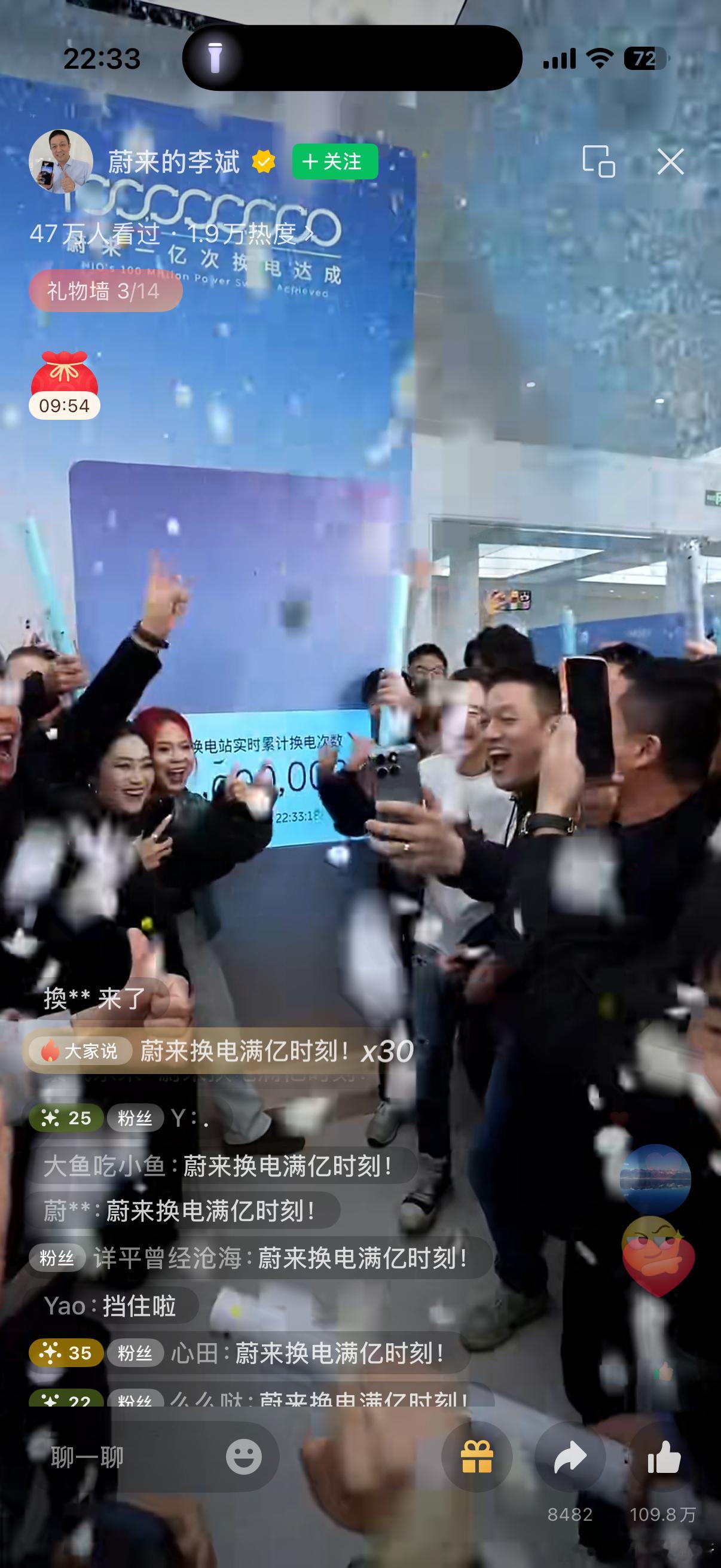 2 月 6 日 22 时 33 分,蔚来第 1 亿次换电在浙江海宁完成