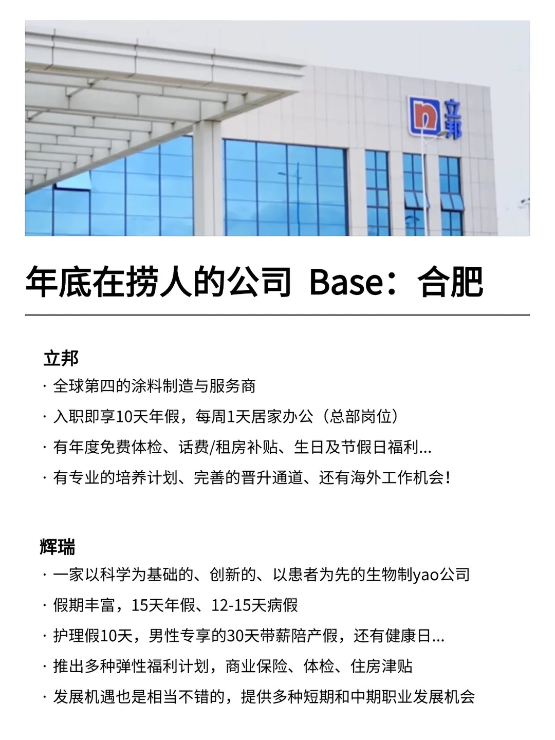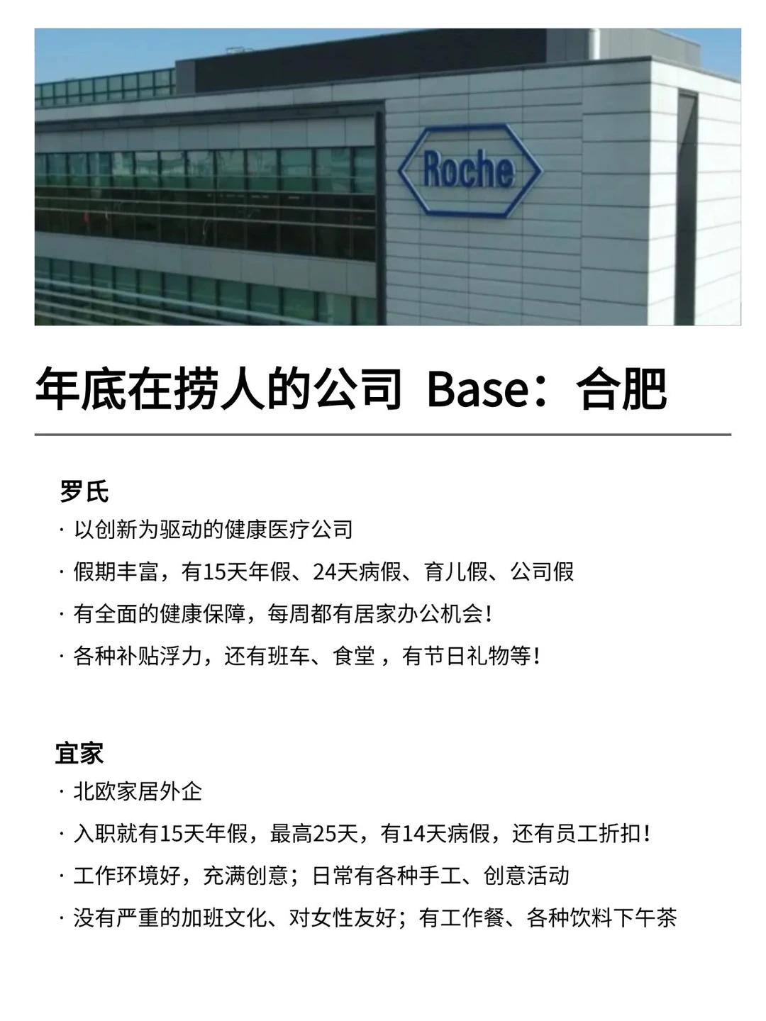 合肥发展真的越来越好,有不少小而美、冷门宝藏的公司,机会是真的很多的! 特别是有不少小众冷门的外企,真心建议大家可以去试试 · 为什么还是值得去外企? ✔️氛围好,对女性友好,年假长,基本上都是10天起步 ✔️很多还都支持居家办公、福利完善,是真的能实现WLB ✔️待遇也还不错,想在年后找工作的真的可以考虑考虑~ · 坚持日更✊🏻,帮大家在找工作路上顺利拿 offer! ·