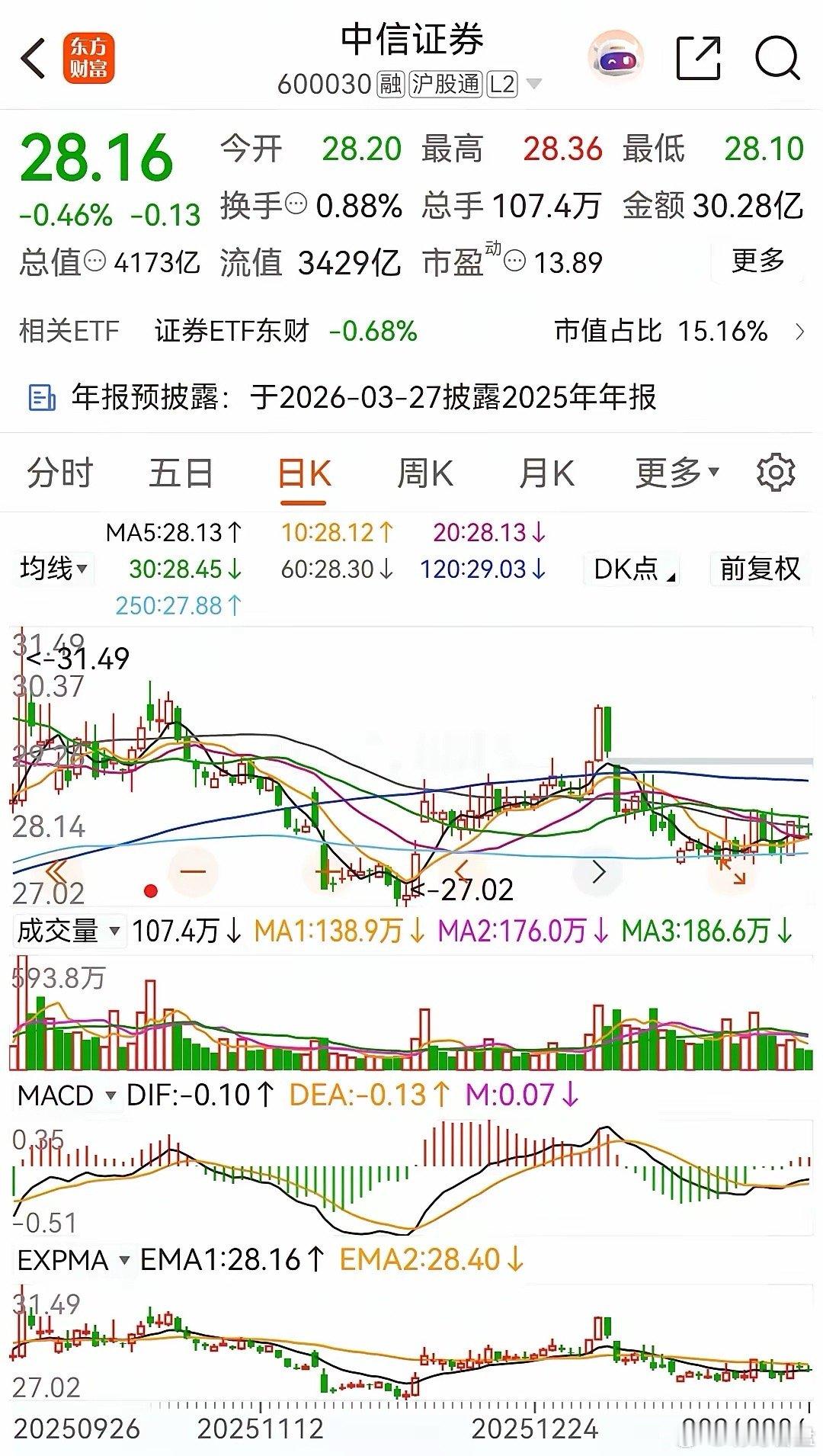 东方财富今天被主力大幅净卖出8.1871亿元,而中信证券则是连续三天被主力资金净买入,今天的净买额为0.4546亿元。截止今天收盘,东财在2026年的跌幅为2.24%,而中信证券在2026年的跌幅则为 1.92%。东方财富今天低开后在低位震荡整理,尾盘时加速杀跌,跌幅为1.18%,收盘报价为22.66元。在资金流向上,今天被主力资金净卖出8.1871亿元,近五个交易日则是被主力资金合计净卖出了 14.6263亿元。中信证券今天低开后在低位缩量震荡整理,收盘时跌了0.46%,收盘报价28.16元。在资金流向上,目前已是连续三天被主力资金净买入了,今天的净买入金额为0.4546亿元,本周则是被主力资金合计净卖出了约1.9404亿元。从走势上看,近期一直都处于磨底的过程中。至于更详细的技术分析,可以查看上一篇中关于券商概念板块的走势分析。对于券茅和券商一哥来说,当前是风险与机会并存,主要体现在:一是政策敏感,两融保证金比例上调至100%(2026年1月19日实施)直接压制经纪业务收入,东财受影响大于中信;二是技术催化:T+0试点或延长交易时间政策若落地,东财因弹性更大可能率先涨停;三是估值修复:券商板块PB估值1.29倍处历史18%分位 ,中信1.1倍PB、东财2.3倍PB,对比银行保险具比较优势。