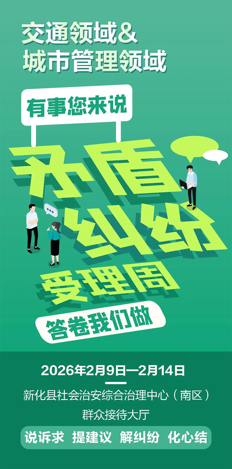 为创新推进综治中心规范化建设和实体化运行,方便群众反映诉求和政策咨询。根据新化县社会治安综合治理中心建立职能部门矛盾纠纷受理周制度,2026年2月9日—2月14日,由县交通运输局、县城市管理和综合执法局受理本行业本领域矛盾纠纷和其他诉求事项。届时,欢迎广大群众来新化县社会治安综合治理中心(南区)群众接待大厅反映相关矛盾纠纷诉求、意见、建议和需要解决的问题。