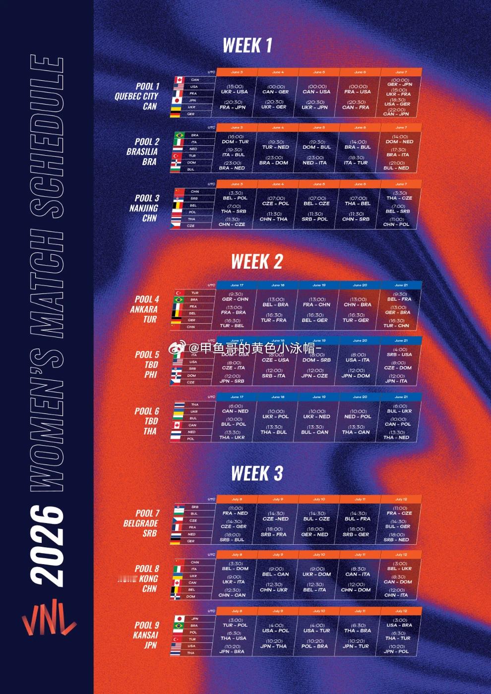 2026年世界男排联赛、2026年世界女排联赛赛程表出来了,图中均为当地时间20