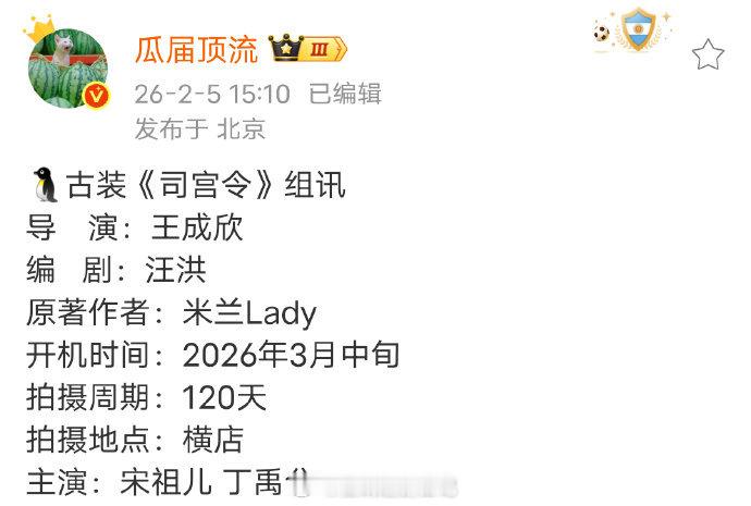 🍉🍉宋祖儿和丁禹兮的剧基本算是定下来了,编剧是司藤的编剧~她后边好几部剧等着给她开《司宫令》组讯已出,预计3月开机。S级古偶,大女主职场升职记,看起来也是平番在后…远远不如月都花落,不懂丁禹兮为什么会接这个本子?谁一 番还是平?这个编剧真的极差~其实,司宫令如果是丁禹兮和宋祖儿演我挺期待的,因为两位年轻的演员演技都很好,很会演 你们觉得这对cp如何?