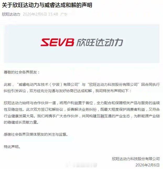2月6日,欣旺达(300207)公告称,全资子公司欣旺达动力与吉利系旗下威睿电动的诉讼在一审阶段达成和解,威睿电动将在《和解协议》生效后撤回起诉。这场涉案金额23.14亿元、被称作“车企起诉电池企业第一案”的纠纷落下帷幕,双方回归协商轨道,为新能源产业链的稳定发展释放出积极信号。