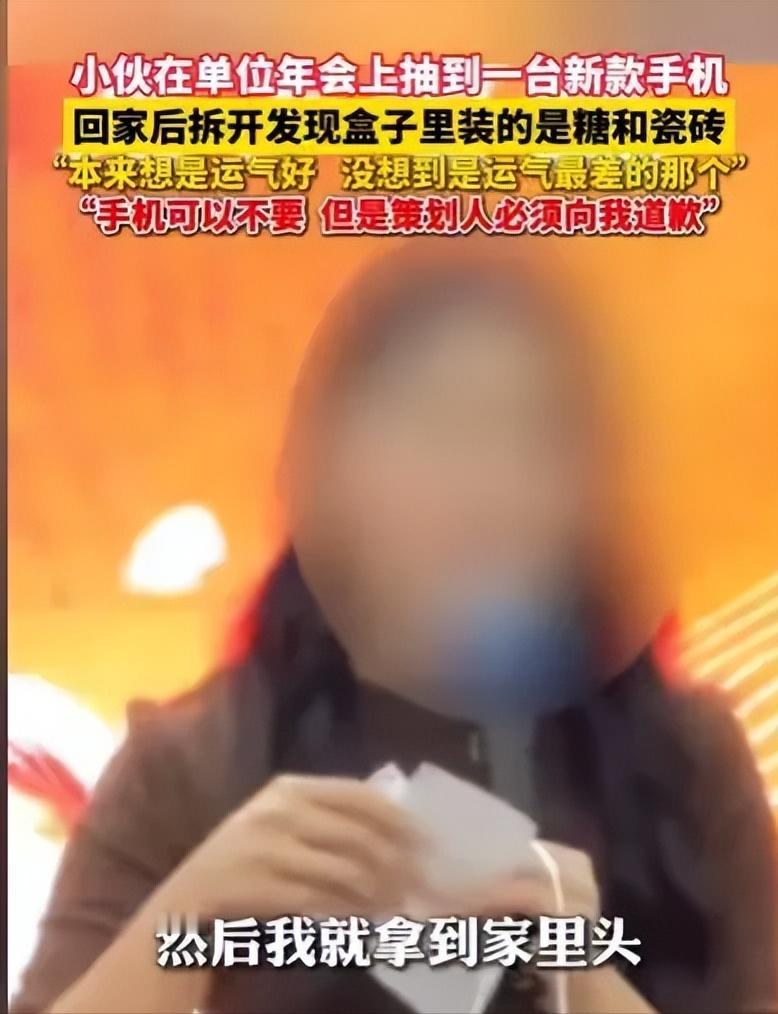 “玩不起吗?”广东珠海,男子在年会抽奖,得了特等奖,奖品是价值9988元的手机,老板亲自颁奖,男子想把这个运气送给妻子,他没有当场拆开,他要给妻子一个惊喜,不料妻子拆开,里面居然是两块瓷砖,他很气愤,感到被欺骗了,并且这件事老板居然是不知情的。 近日,广东珠海一家公司举办年会,男子是这家公司的老员工,平日里工作踏实肯干,默默付出,从来没有想过自己会成为年会的“天选之子”。 当主持人念出男子名字的那一刻,全场瞬间安静了一秒,随后爆发出雷鸣般的掌声和欢呼声,男子自己也懵了,愣了几秒才反应过来,自己真的中了特等奖。 他激动地站起身,一步步走上舞台,脸上满是掩饰不住的喜悦,老板亲自拿着奖品包装盒,笑着走到他面前,亲手将这份沉甸甸的特等奖交到他手里,还笑着叮嘱他,好好享受这份好运,也祝愿他和家人新年快乐。 接过奖品的那一刻,男子心里暖暖的,手里的包装盒沉甸甸的,触感和平时见到的手机包装盒一模一样,他下意识地想拆开看看,可转念一想,马上就能见到妻子了,不如把这份惊喜留到回家,亲手交给妻子,让她也感受一下这份好运。 年会结束后,男子连和同事庆祝的心思都没有,小心翼翼地抱着奖品包装盒,快步走出年会现场,心里满是期待,脑海里一遍遍幻想着妻子拆开奖品时惊喜的模样。 回到家后,妻子早已做好了热乎的饭菜,等着他回来,看到他手里抱着一个精致的包装盒,满脸好奇地询问是什么。 男子说惊喜,妻子听完后,眼睛瞬间亮了,满脸期待地接过包装盒,小心翼翼地拆开包装,心里满是欢喜。可这份欢喜,仅仅持续了十几秒,就被彻底打破了。 妻子一层层拆开外包装,打开手机包装盒的那一刻,脸上的笑容瞬间僵住,眼里的期待也一点点消失,取而代之的是满脸的疑惑和不解。 包装盒里,根本没有什么价值9988元的手机,只有两块平平无奇、冰冷的瓷砖,大小和手机差不多,刚好能填满整个包装盒,不仔细看,根本发现不了破绽。 男子站在一旁,看着妻子脸上的表情变化,心里也咯噔一下,连忙凑过去查看,当看到包装盒里的两块瓷砖时,他瞬间懵了,随后,一股难以抑制的气愤涌上心头。 他怎么也没想到,自己在年会上万众瞩目的特等奖,老板亲手颁发的奖品,竟然是两块瓷砖,自己满心欢喜地想给妻子一个惊喜,最后却变成了一个天大的笑话,那种被欺骗、被愚弄的感觉,让他浑身都不舒服。 男子越想越气,连夜联系了公司的行政人员,质问奖品的事情,询问为什么特等奖会变成两块瓷砖,是不是有人故意恶作剧,故意愚弄自己。 行政人员得知此事后,也十分惊讶,连忙展开调查,一番询问和核实后,才得知了事情的真相,也让男子更加气愤——这件荒唐事,竟然是公司负责年会策划的人员搞的鬼,而老板,从头到尾都不知情。 原来,负责年会策划的人员,为了所谓的“活跃气氛”,一时兴起,搞了这样一个恶作剧,他偷偷将原本准备好的特等奖手机调包,换成了两块瓷砖, 想着等男子发现后,再出面解释,当成一个玩笑,却从来没有想过,这样的恶作剧,会给男子带来多大的伤害和困扰,也没有想过,这件事会影响到公司的口碑。 随后,老板主动联系了男子,向他表达了深深的歉意,承诺会立刻为他更换真正的特等奖奖品,按照原本的约定,给他一部价值9988元的手机, 同时,还会给予他一定的补偿,弥补他受到的委屈和困扰。负责策划的人员,也主动向男子道歉,承认自己的错误,解释自己只是想活跃气氛,没有恶意,希望男子能够原谅。 男子虽然依旧有些气愤,但看到老板真诚的道歉和积极的处理态度,也渐渐平复了心情,接受了老板的道歉和补偿方案。 他表示,自己生气的不是奖品本身,而是被欺骗、被愚弄的感觉,毕竟,那是自己凭运气抽到的特等奖,也是自己想送给妻子的惊喜,最后却变成了一场闹剧。 对此,你们有什么看法,欢迎评论留言~