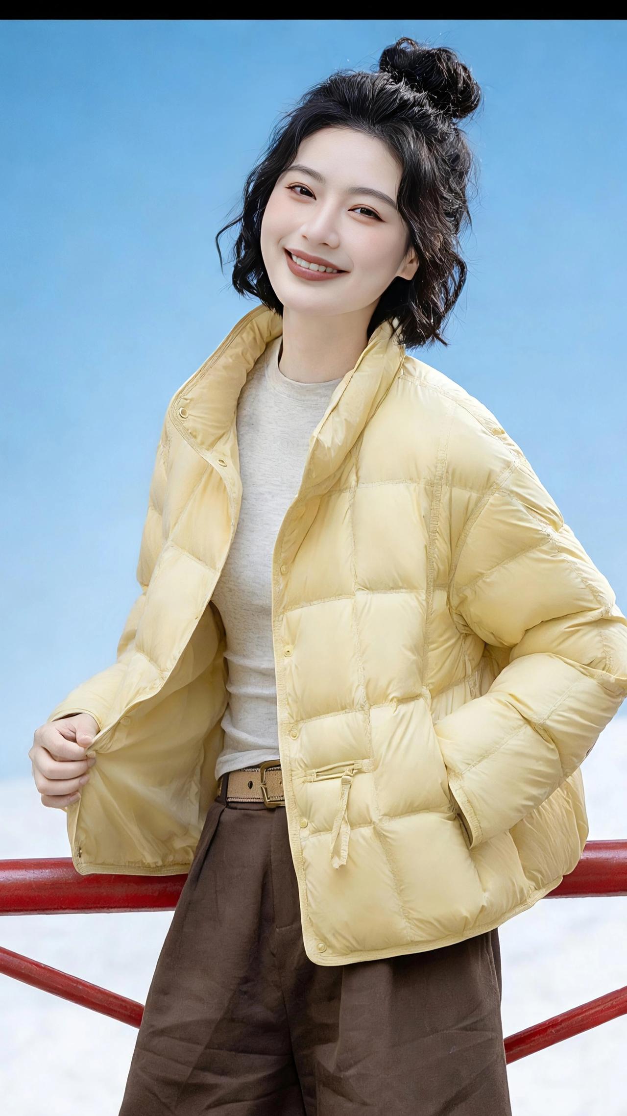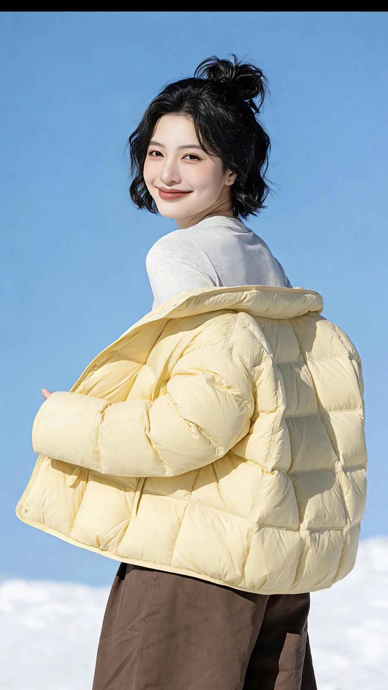 冬日里的一抹暖黄 在澄澈如洗的蓝天之下,她像一阵轻快的风,撞进了这片纯白的雪色里。 蓬松的鹅黄色羽绒服裹着她纤细的肩背,像把整个初冬的暖阳都揉进了衣料里。立领半敞着,露出里面浅灰色的打底衫,简洁又温柔。深棕色的阔腿裤随着她的动作轻轻摆动,在雪地上投下柔和的影子。她的笑容比阳光更明媚,丸子头俏皮地立在头顶,几缕碎发被风吹得轻扬。 她时而转身,让羽绒服的下摆扫过矮墙的积雪;时而抬手拢一拢衣领,指尖的温度仿佛能融化周遭的寒意。阳光落在羽绒服的格纹肌理上,折射出温润的光,为清冷的冬日镀上一层暖融融的滤镜。在蓝天与白雪的纯粹背景里,这抹鲜活的暖黄,成了整个冬天最温柔的注脚。 高级感穿搭 新年穿搭 高品质羽绒服 冬季穿搭