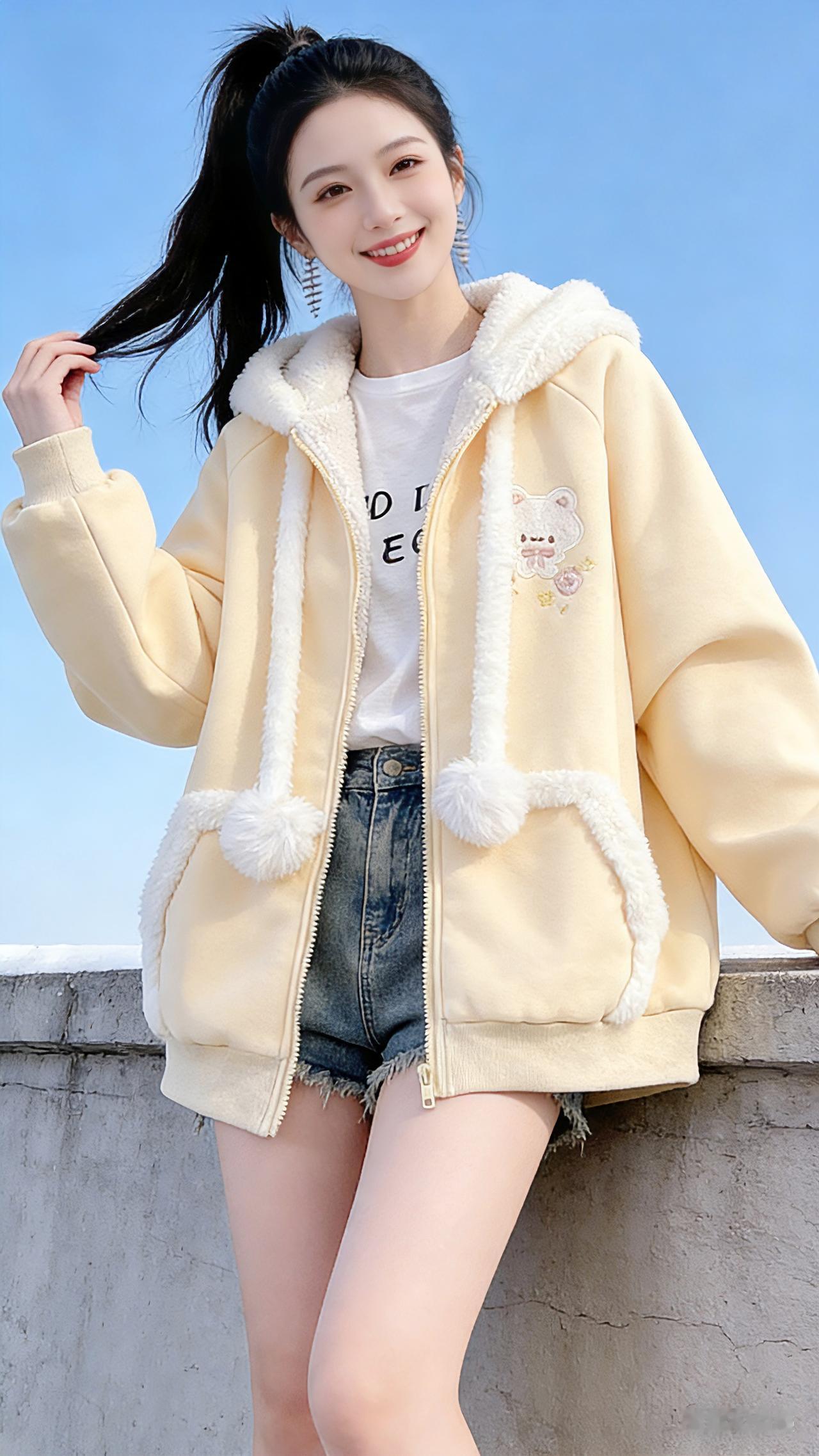 晴日里的奶黄包 风是暖的,天是透亮的蓝。她像一颗刚出炉的奶黄包,裹着蓬松的绒毛帽子,站在矮墙边,整个人都在发光。 鹅黄色的外套松松垮垮地罩着,衬得里面的白T恤愈发干净。毛绒绒的帽檐垂着两根带子,末端的毛球随着她的动作轻轻晃悠,像春天里刚抽条的柳芽,俏皮又温柔。 她时而歪头微笑,马尾辫在脑后甩成一道活泼的弧线;时而转身回望,耳坠在阳光下闪着细碎的光;时而抬手掠开被风吹乱的发梢,露出一截纤细的脖颈。衣摆上那只刺绣小熊,也跟着她的笑容一起,在暖融融的空气里变得软乎乎的。 这是不用加糖的甜。在晴好的日子里,一件软乎乎的外套,一个没心没肺的笑容,就足以把所有烦恼都晒得暖洋洋。 高级感穿搭 新年穿搭 冬季穿搭 卫衣