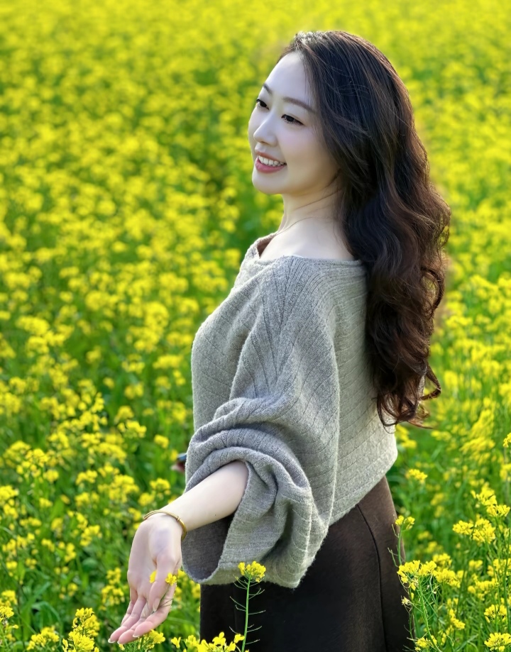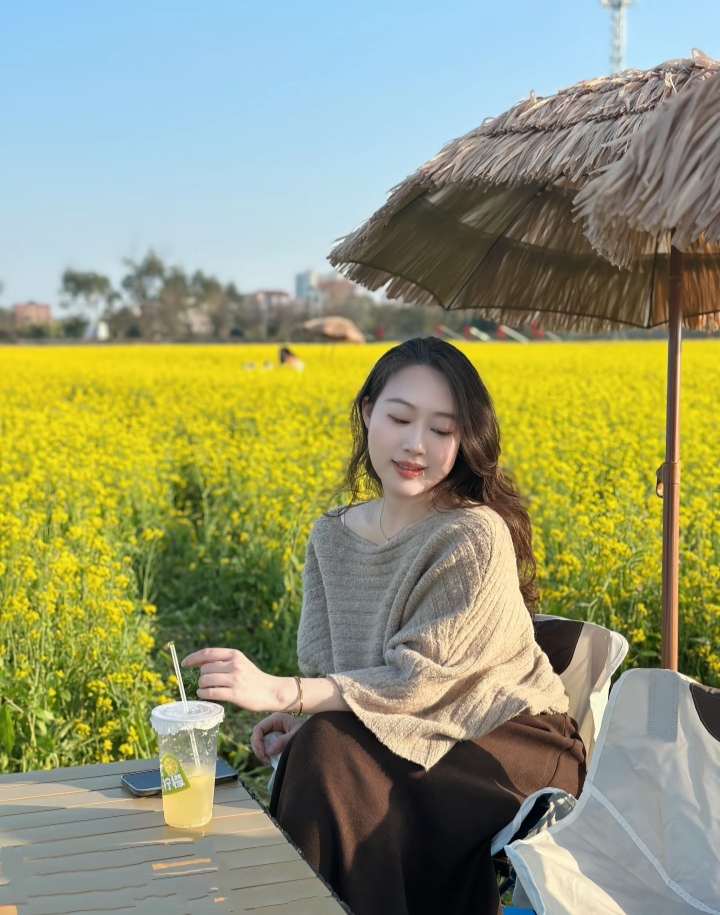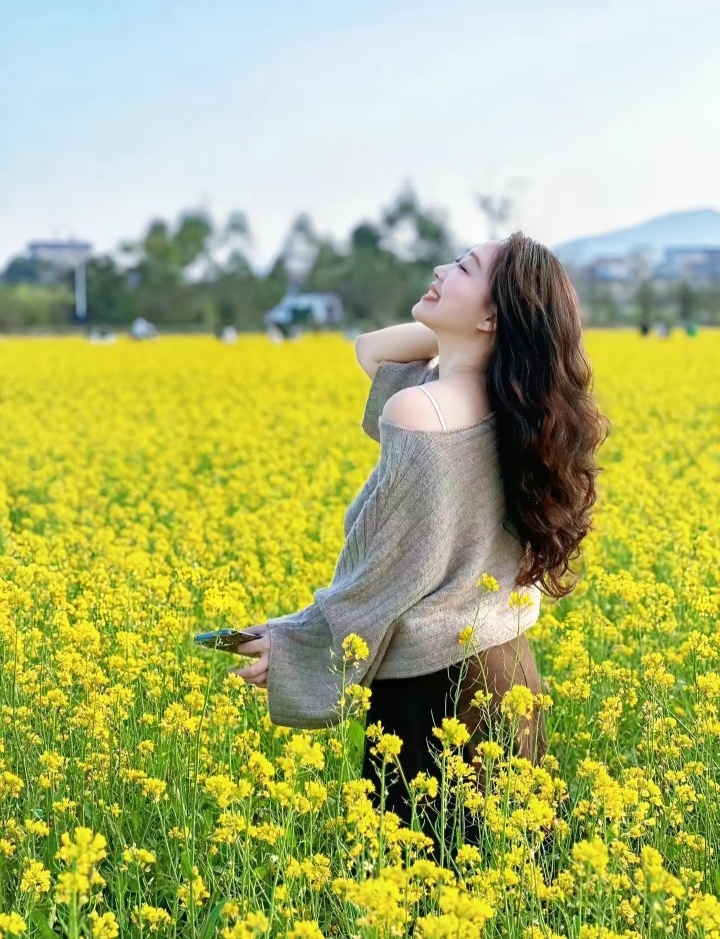 油菜花田一娇娘,半露香肩风也醉