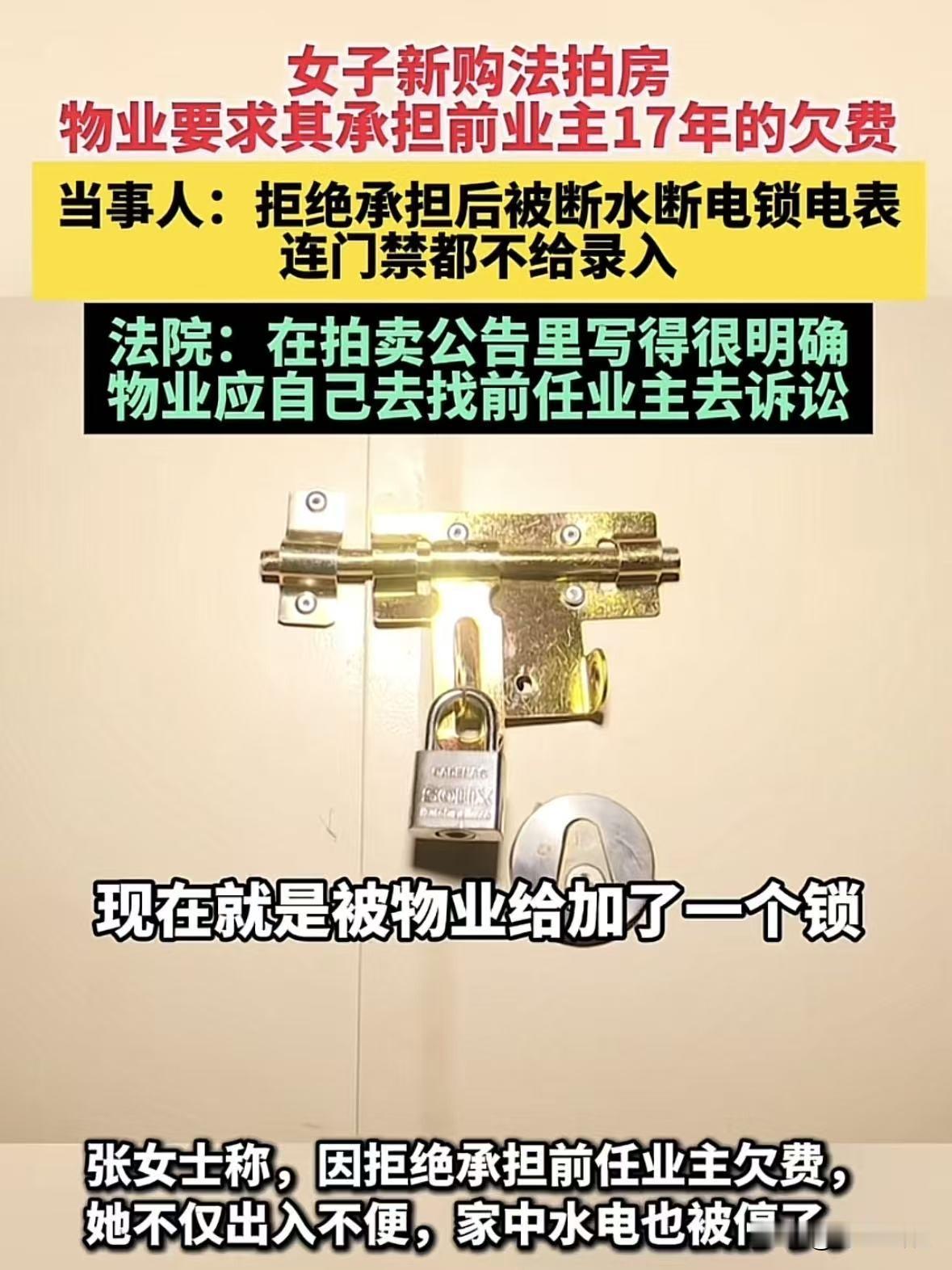 福建莆田,女子法拍了一套房子,办完手续后刚准备入户,物业就找到她,让缴纳前业主之前欠的物业费,一共60000元,女子懵了,前业主欠的你找我干啥?合同里写着我只承担之前的红毯水电费、其它的跟我没关系,可物业才不管这些,见女喜不交钱,直接把水电给断了,电表箱都锁上,生怕他们打开,连门襟也不给录,女子气坏了,这不明摆着欺负人吗?于是找到媒体曝光此事! 张女士在外打拼十几年,一家三口挤在出租屋里,经常搬家。 那种没有根的漂泊感,让她对“家”特别渴望。 可现实总是骨感,手里的存款不算宽裕,看的房子要么户型不合心意,要么价格高得让人望而却步。 看了那么久的房子,每次都是满心欢喜去看房,最后只能失望而归。 直到有一次,她像往常一样在网上刷房源,无意间点开了一个法拍房的链接,一下子就挪不开眼。 这套房子,从格局到楼层,不管是采光还是通风都是没得说。 最主要是价格,比同小区市场价都低很多,简直就跟天上掉馅饼一样。 张女士激动得赶紧喊来老公一起看,夫妻俩反复研究,越看越满意。 后来张女士顺利拍下这套房子,过户,拿钥匙都特别顺利。 从那以后张女士天天盘算着怎么装修,哪里放沙发,哪里做衣柜,连孩子的房间都规划好了。 转眼就到了2026年1月,张女士想着赶在年前把装修方案定下来,年后就能开工,用不了多久就能入住。 可万万没想到,就在她兴冲冲地带着装修公司的人准备入户测量规划的时候,物业的人却主动找上了门。 物业工作人员开门见山,语气硬邦邦的告诉张女士:你是业主对吧? 你这套房子的前业主欠了不少费用,总共6万块,你得先缴清了才能装修。 工作人员一边说,一边掏出一张皱巴巴的手写单子。 张女士瞪大了眼睛,一脸困惑,自己刚买的房子,一天都没住过,也没产生任何费用,怎么就欠了6万? 工作人员告诉她,这6万包含前业主欠了17年的公摊水电费,一共1.3万,还有近4万的物业费,加起来刚好6万。 张女士一下子就急了,拍卖书上写得明明白白,物业费该物业向原业主追偿,我只需要承担公摊水电费就行。 而且你们这手写的单子也太不正规了,连个明细都没有,都是什么钱,每一笔总得说清楚。 后来张女士回家特意把合同书找出来,想着拿回去和物业沟通。 可让她没想到的是,没过几天,物业竟然直接把她家的水电都断了。 连门禁信息都没给她录,进出小区只能等其他业主开门,有时候一等就是十几分钟。 后来张女士多次找物业交涉,反复强调拍卖书约定,可物业执意谁买房谁缴费。 几经周折,物业才勉强恢复供水,但仍断着电,电表箱还上了锁。 眼见房子没法装修,张女士又急又气、夜不能寐,她不愿白白承担6万元欠款。 张女士实在没办法,最终找到媒体曝光此事。 记者接到张女士的求助后,很快就赶了过来,详细了解了事情的来龙去脉。 随后,记者陪同张女士一起前往物业沟通,可面对记者的镜头和提问,物业工作人员却瞬间变了脸。 不是低头不语,就是找借口躲进了办公室,拒绝回应任何问题。 无奈之下,记者只能带着张女士的疑问,向相关部门反映了此事。 《民法典》第944条规定:业主应当按照约定支付物业费,但逾期不支付的, 物业服务人只能通过催告、诉讼或仲裁方式追偿,不得采取停止供电、供水等方式催交物业费。 法院表示,前业主的欠费属于其个人债务,与新业主张女士没有任何法律关联,物业无权强制张女士承担这笔费用。 这笔拖欠了17年的物业费和公摊水电费,可以起诉之前的业主追偿。 现在物业私自采取断水断电的违法手段,完全不符合法律规定。 后来,迫于压力,物业主动联系了张女士,说愿意坐下来协商解决。 经过一番沟通,张女士和物业最终达成了协议:张女士支付3万元。 包含1.3万的公摊水电费和部分协商费用,物业立即为她恢复水电供应,并录入门禁信息,允许她正常装修。 对此,不少人替张女士打抱不平:太离谱了,前业主欠了17年的费,他们自己不维权。 现在新业主来了就上门逼债,还断水断电,这不是明摆着欺负人吗? 还有不少人认为:法拍房本来就比市场价低很多,相当于捡了漏。 房子产生的相关费用,新业主承担一点也合理,哪能什么好处都让你一个人占尽。 对此,你怎么看这件事呢?欢迎评论留言! @静心法谈 学法辨是非,慬法不吃亏。