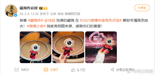 【#肖战藏海专属娃衣有点萌微博之夜#首次亮相,造型神还原剧中标志性服饰。#肖战捎来春天# 肖战(扬子晚报)