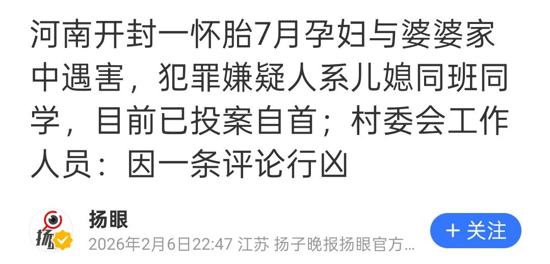 冲动是魔鬼,这话一点不假。 据扬子晚报扬眼官方账号报道,2025年11月30日下午5时许,河南省开封市毕桥村发生了一起重大刑事案件,一怀胎7月孕妇与婆婆在家中遇害。 据知情人士透露,事情的起因是抖音平台上的一条评论,而凶手是该孕妇的初中同学。 据称,两人近五年没有通话记录,但是因为近期在抖音平台互动时的一句评论“这么些年了,你还没个女朋友“,怀胎7月孕妇与婆婆便招来杀身之祸。 因为一时冲动,酿成大错,触犯法律,给受害者家庭带来了无尽的伤痛 ,而犯罪嫌疑人自己的人生轨迹也将发生重大变化。 同学之间,为什么一句并不算过分的评论会引发命案?原因就在于,这句话可能戳中了这位男同学的痛处,让其瞬间失去了理智。 尽管因为一句评论而杀人 ,的确过于冲动,犯罪嫌疑人需要承担法律责任,但是这件事也警示人们,网络言论也要注意分寸。 为什么这么说?因为人与人的想法不一样,每个人的处境也有所不同。你以为的一句玩笑话,在别人看来可能就是侮辱。 据了解,事发后,凶手主动投案自首。目前,该案仍在公安机关侦查阶段。