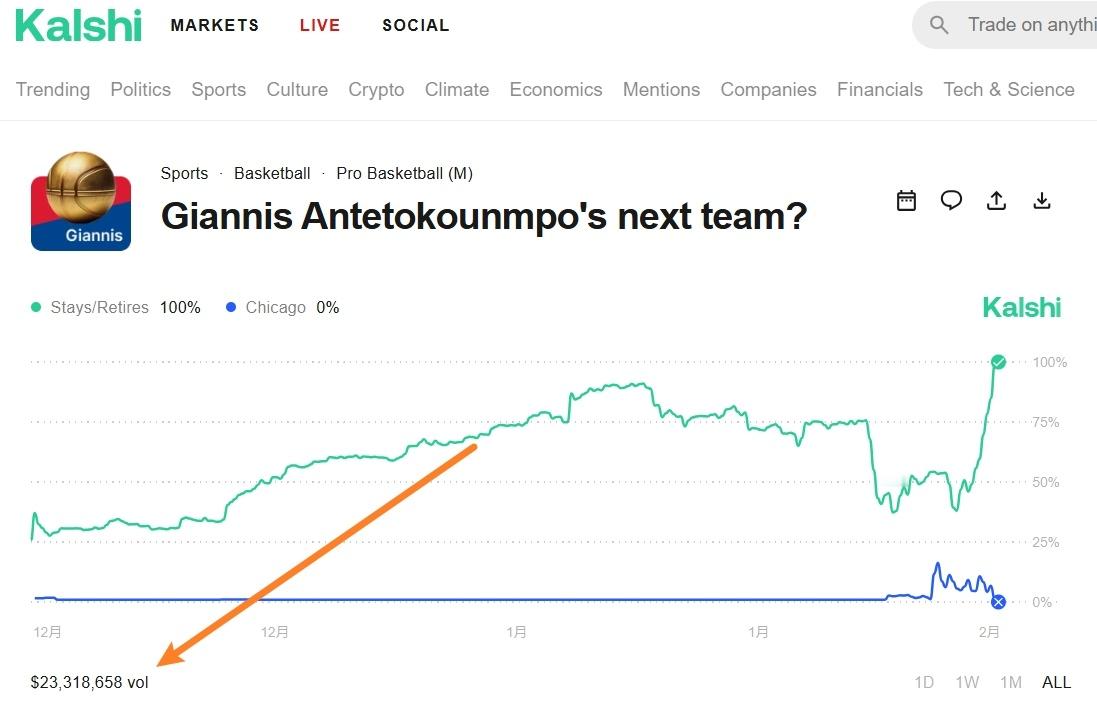 也有其他媒体质疑:扬尼斯编造了一个他将离开雄鹿队的谣言,导致人们在不受监管的赌博/内幕交易平台 Kalshi 上总共下了 2300 万美元的赌注,赌他会去哪里。
