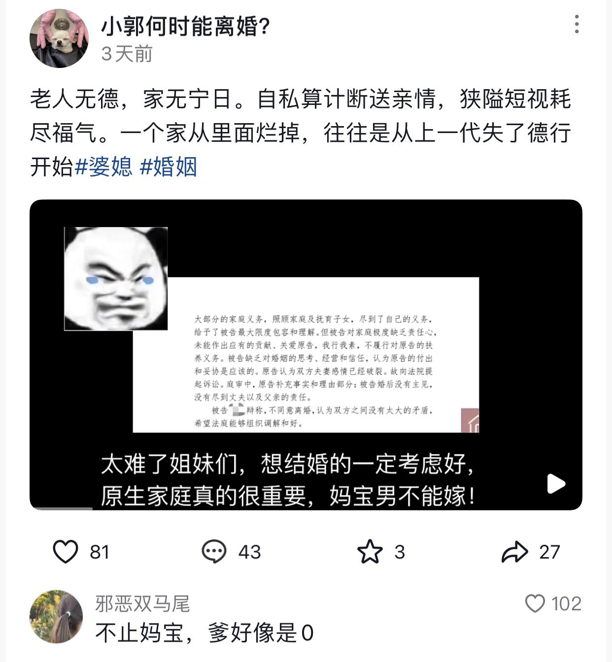 坐月子给儿媳吃过期燕麦的婆婆,在网上扭来扭去跳水蛇舞的公公,花老婆彩礼不管事的妈宝老公。生孩子前一家人对博主百依百顺,生完孩子后态度180度大转变,以为可以拿捏儿媳。 刷到博主小郭吐槽婆家极品一家人,博主剖腹产生了个女儿,第九天婆婆反向伺候,给虚弱的儿媳吃过期燕麦片,将亲戚给的钱装进自己兜里,将邻居送的小米鸡蛋炫进自己嘴里。不想哄孙女了就跟别人说儿媳妇不让,博主出月子瘦了,而婆婆反而胖了不少。对外那是七个不服八个不忿的,跟谁都能吵上两句。 而公公是两耳不闻窗外事一心只跳水蛇舞,一大把年纪天天在网上扭来扭去,喜欢跟同龄老头交流,据说还是个零。博主带孩子在广场摆摊,公公混迹在人群里跳舞。在家上完厕所不喜欢自己冲,非要留给儿媳妇冲。 博主那结婚前百依百顺的演员老公,结婚后看到博主生的是女儿,干脆装都不装了,对自己爸爸妈妈的极品行为视而不见,最绝的是不仅工资一毛钱不交,所有家庭支出用的全是博主的彩礼钱。 最后博主实在无法忍受老公这一家子极品,直接要求离婚。公公婆婆得知后立马化身狗头军师给儿子出谋划策,让他一直拖着不离婚,意图不抚养孩子,不给抚养费。关键他们不想养孩子,还不愿意把户口本给博主,博主与他们多次沟通无效。 最好笑的几千钱的抚养费他老公是一拖再拖,到最后还闹到了帽子叔叔那里,之后博主老公在帽子叔叔面,按手印拍胸脯保证周日必给抚养费,结果转头就给博主上演没钱的借口大全,“没挣上”,“再凑凑”,“月底前给”。最后4个月一共给3000块抚养费还要拆成4笔给博主,像是怕博主拿着这些钱跑了一样。博主为了讨这些钱还把嗓子气罢工了,贴三天膏药还搭进去600块。