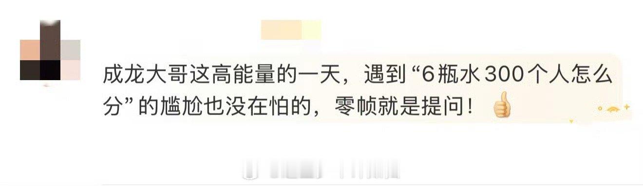 成龙6瓶水300个人怎么分啊 论脑洞和好奇心的天花板,还得看成龙!300人分6瓶水的世纪难题,估计只有他能一脸认真地提出来。但仔细一想,这不正是他“活到老,学到老,问到老”年轻心态的最佳写照吗?大哥用行动证明:保持提问,就是保持活力的秘诀!