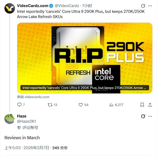 IT之家2月7日消息,参考外媒VideoCardz报道和更多细节证据,英特尔已取消推出酷睿Ultra9290KPlus处理器,不过其它的桌面端"ArrowLakeRefresh"型号仍将发布。