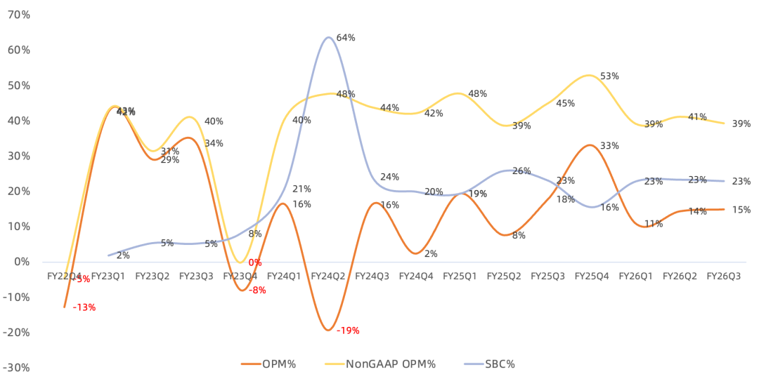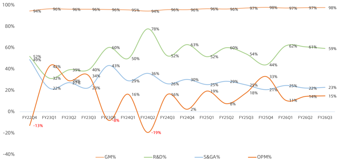 GAAP毛利率97.4%,同比提升0.4个百分点,略低于市场一致预期的97.7%,仍领跑全球大部分公司;