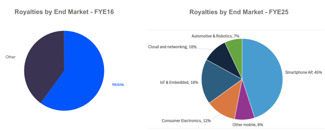 管理层表示假设2026年手机出货量减少20%,会导致Arm手机Royalty收入受影响约4%-6%,对公司整体影响带来约1%-2%的负面影响;每一代手机周期都会交付全新的CSS,每次交付新CSS的Royaltyrate通常都会同比提高,所以只要当手机的v9在向CSS迁移,每年都会按更高的Royaltyrate定价,实现年复一年的Royalty收入提升;