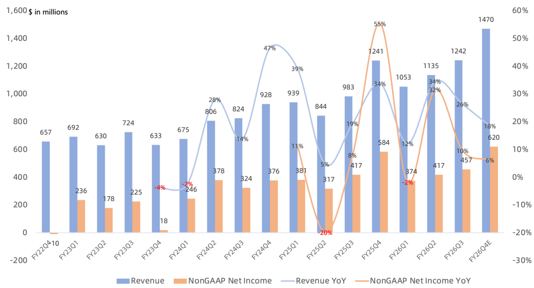 预计下季度营收14.7亿美元,同比增长18%;NonGAAP净利润6.2亿,同比增长6%;