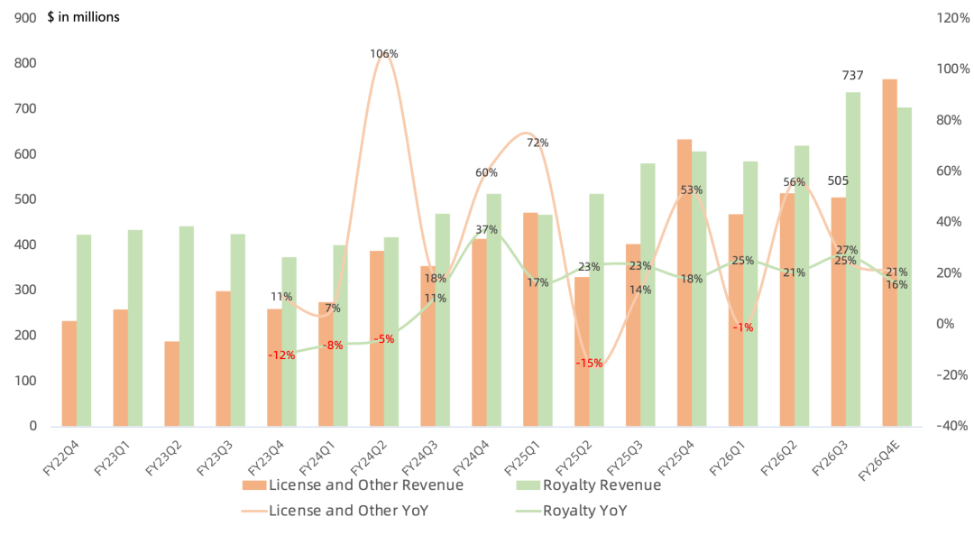 预计Q4Royalty收入同比增长低两位数,License营收同比增长高两位数;管理层表示Q3原本以为Royalty增长20%,实际增长27%,Q4也看到部分延续,那这种强势是否会延续到明年,目前认为还很难说,主要因为内存甚至晶圆产能短缺;
