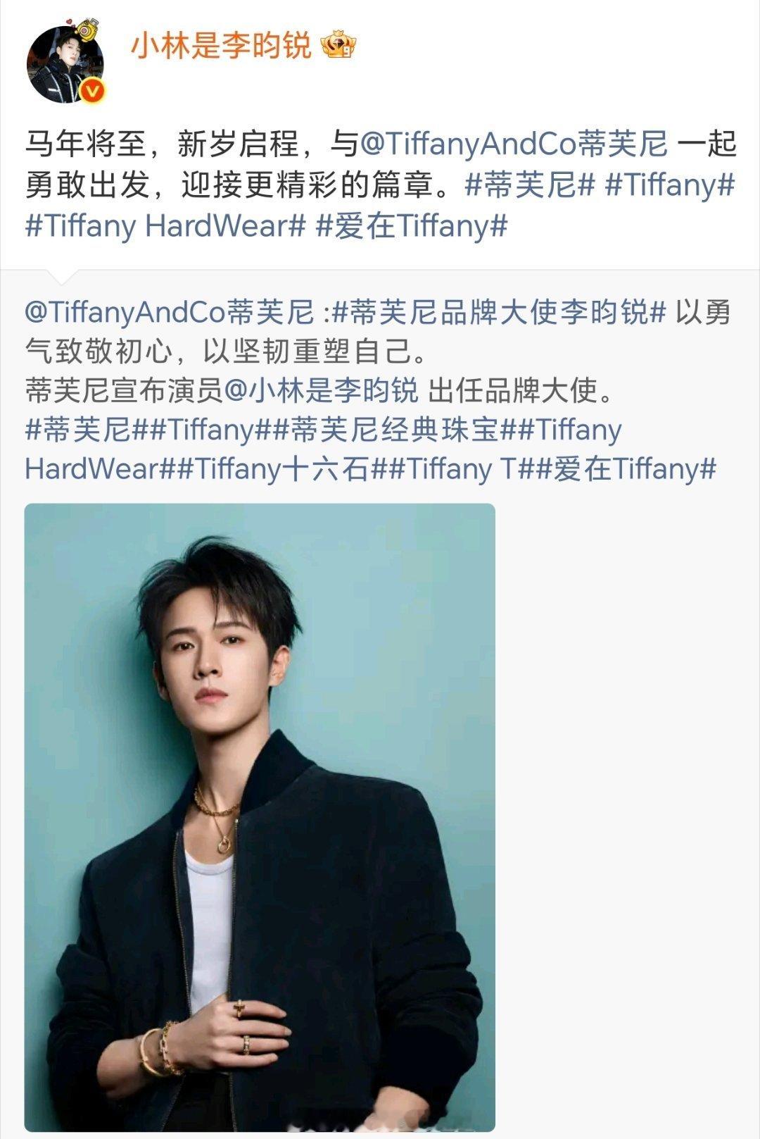李昀锐官宣Tiffany品牌大使!🈚️考察期,🈚️任何站台,直接空降顶奢,小林的商业价值太顶了,手握两大顶奢的大爆生👍