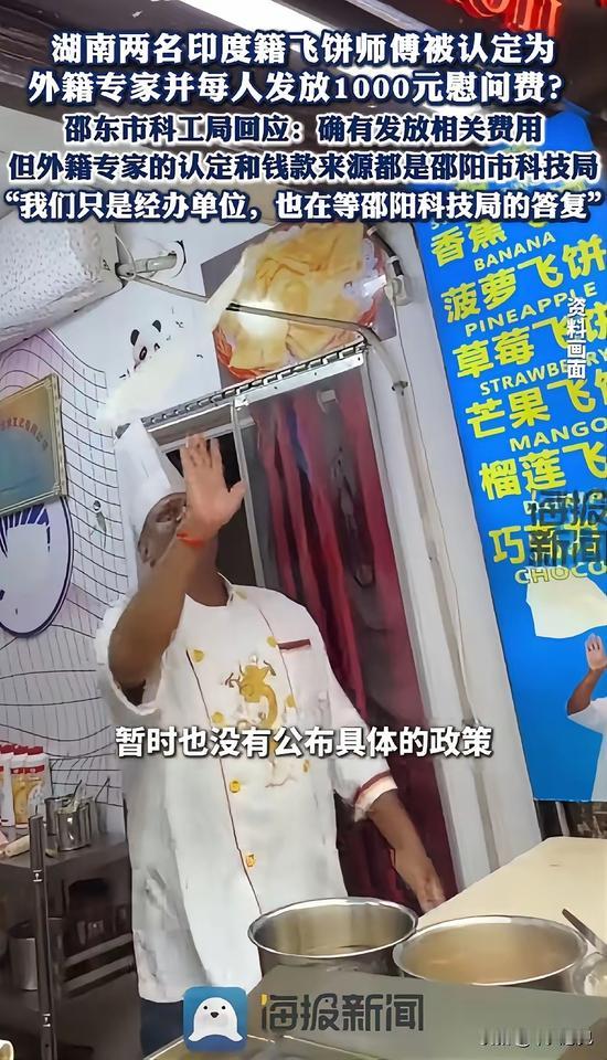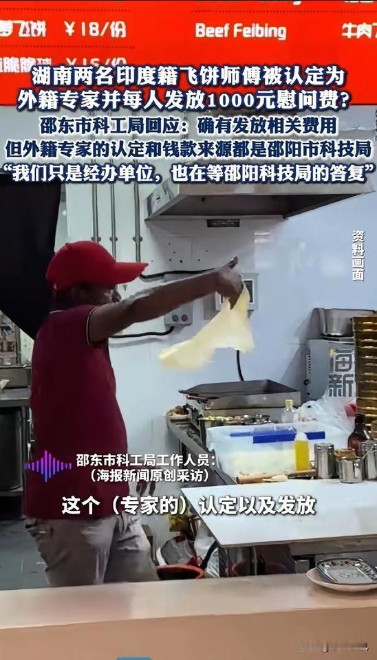 特大喜讯!!! 恭喜在华售卖飞饼的印度厨师,在湖南喜提外籍专家身份,并获得千元奖励! 古语说:三百六十行,行行出状元!这还真是! 虽然我不知道制作和销售印度飞饼能有多大的科技含量,多少的稀缺性,对国民生活和科技水平的发展能提供多少助力?但湖南的政府能对其外籍专家的身份认定,相信其一定给社会做出了突出贡献! 国家和民族的发展,需要的是包括地方政府在内,切实的负起责任,做好做实自己的本职工作,不能人浮于事。 南宋史有句话:中书满街有,都督随地走! 这个社会有个设置叫做:门坎!希望有些人能明白它的含义!