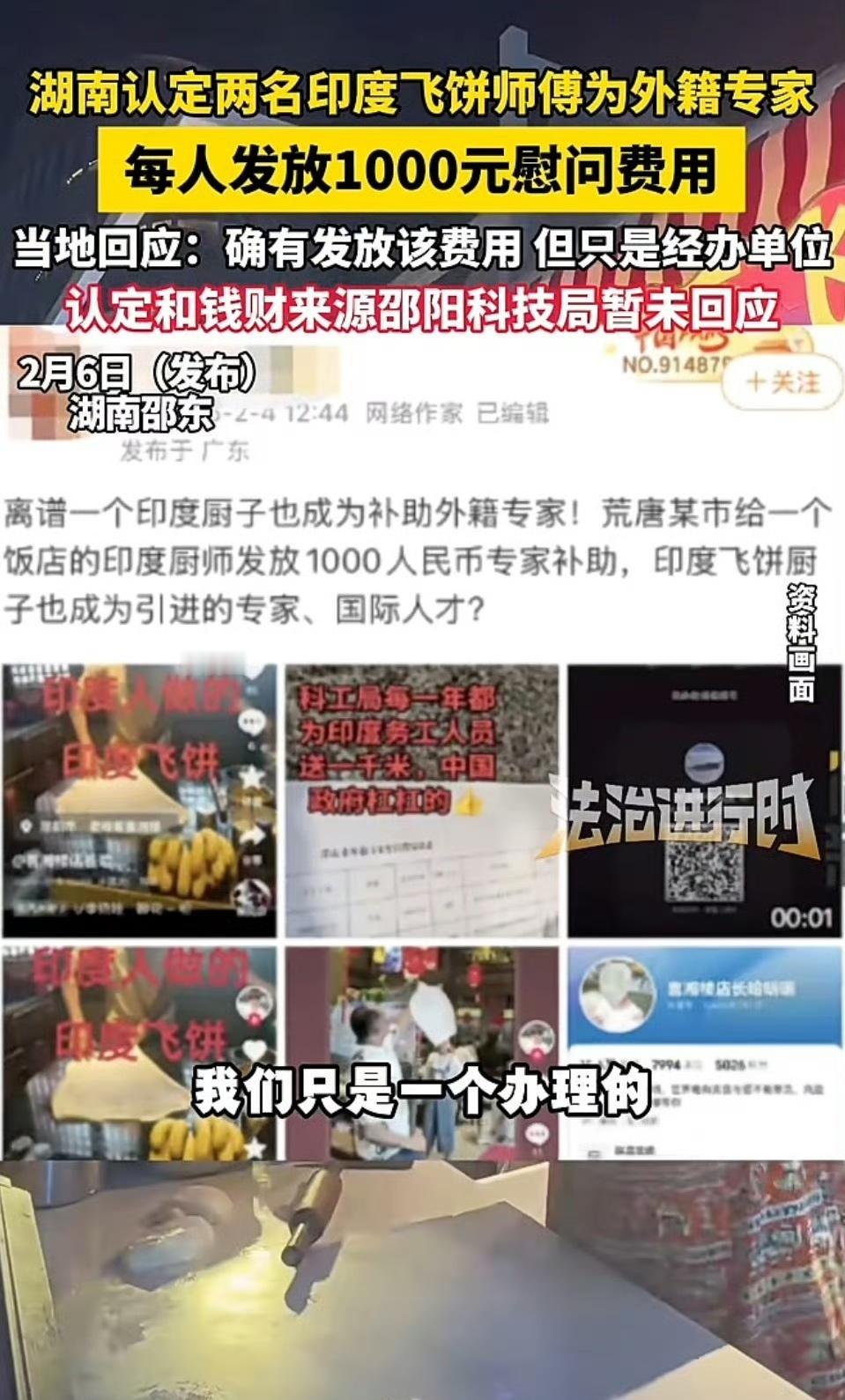 两名印度飞饼师傅为何能成为邵阳市科技局的“外籍专家”?甚至有1000元慰问费,邵东市科工局作为经办单位,居然搞不清楚,把“皮球” 踢给认定单位邵阳市科技局。印度飞饼师傅凭什么认定为外籍专家时事满谈