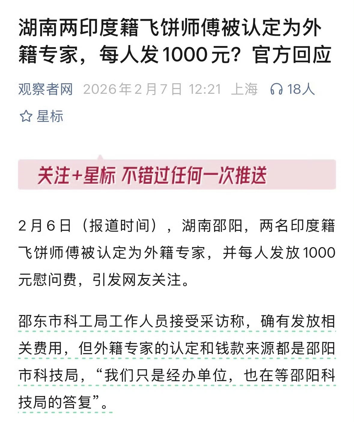 邵阳作为内陆城市,吸引“高精尖缺”外籍专家的能力较弱,但还有相关KPI考核,难道就该只看外籍身份?这是浑水摸鱼式的惰政。这不是邵阳一个地方的事儿,其他地级市是否有类似情况,应该好好查一下。印度飞饼师傅凭什么认定为外籍专家
