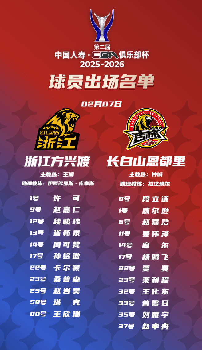 俱乐部杯吉林vs广厦大名单:孙铭徽、塔克出战,姜伟泽在列