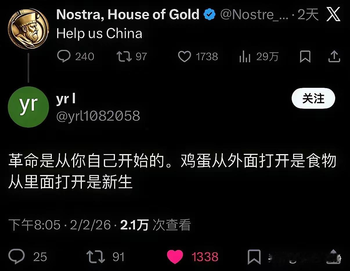 这位德国网友简直就是天才啊,一语道破天机。 就在互联网上,中美两国的网友还在争论,鸡蛋从里面打开和从外面打开的区别的时候 他却从另外一个角度开始分析问题 他问道,如果鸡蛋从最开始就没有受精呢,那么它就无法从内部孕育出新生命 那么到最后他一定会变质的 这句话我们要如何理解呢? 网友表示:鸡蛋 从外面打破是蛋炒饭 从里面打破是大盘鸡! 食物永远只是食物 鸡蛋, 从外面破裂是食物, 从里面打开是新生! 那, 华夏民族朝代更迭, 都是自己打开的, 外面打进来吃掉大家族是不可能的! 撑死它! 这么睿智的话,“鸡蛋从外面打破是食物,从里面打破是新生。”只有我们中国人才能说出来。 西方人从小被灌输的是个人主义,是“人不为己天诛地灭”。个人主义必然导致欺软怕硬,没有人会带头反抗压迫,因为带头的人几乎是必死的结局,牺牲自己,成全别人,那怎么可能?! 北美懦夫们拿起枪,拿起马列主义毛泽东思想,当年中国义和团拿大刀长矛都敢冲向拿着枪炮的八国联军!最后的胜利属于人民! 最近对于义和团的嘲讽,已经出现了反转。 因为有了北美懦夫。 对比之下,手拿菜刀的义和团敢反抗,手拿枪支的北美懦夫却只敢跪地游行。 是啊!28年武装斗争😊3000多万的牺牲!打碎了一切!!建国万众一心埋头苦干!勒紧腰带!几代人啊,才换来今日繁荣富强,感谢上苍,给了华夏一个毛泽东。 送他们一句:王侯将相宁有种乎?再配送一本《孙子兵法》,顺便再送一句:枪杆子里出政权,还送句:革命尚未成功同志仍需努力! 他们所谓的救救我救救我,其实永远是讲的上帝救救我,谁救了他,都相当于上帝救了他。他不会感恩救了他的人,而只会感谢感激感恩上帝。 想起关于“愚公移山”中很多人在说,这个愚公真的很笨,只会去搬山,不会搬家…… 中国人就是有家国情怀,不放弃自己的土地,如果只是搬家,那没有了“自己的根据地或祖地”就是无根之水,要知道任何地方的生存都是抢夺资源,如著名的那句居安不易。而愚公看似愚笨就是在自我改变环境,从而战胜困难。 正是这种精神,让中国人在面对困难时,都是无数的先烈去抗争,从而让我们生活更美! 对比,阿富汗,叙利亚等…更加感谢先烈!