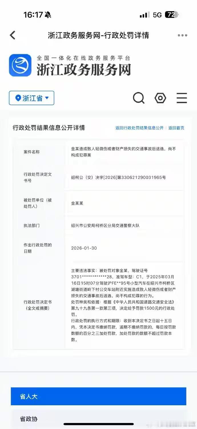 最终结果出来了,演员金晨被警方认定为交通事故后逃逸。 由于情节轻微,尚不构成犯罪,金晨被绍兴警方处以1500元罚款。 2月7日下午16时许,新浪、今日头条等多家网络媒体对这一消息进行了报道。 报道中张贴的一张“浙江政务服务网—行政处罚结果信息公开详情“截图,公布了相关处罚情况。 虽然该截图并未写明肇事者是演员金晨,而是一处显示金某,另一处显示金某某。 但是,从该详情中写明的交通肇事发生的时间、地点、经过以及相关车辆信息,与之前的新闻报道进行比对 ,发现肇事者与演员金晨高度吻合。 据此,多家网络媒体认为,演员金晨交通肇事结果尘埃落定。 此前的1月29日,“金晨被曝疑似涉嫌交通肇事逃逸”事件在网络上闹得沸沸扬扬,引发了公众的热议。 对此,金晨也曾在微博发文, 晒出来自己在事故中受伤的照片,对相关情况进行了说明 ,同时向公众表达了歉意。