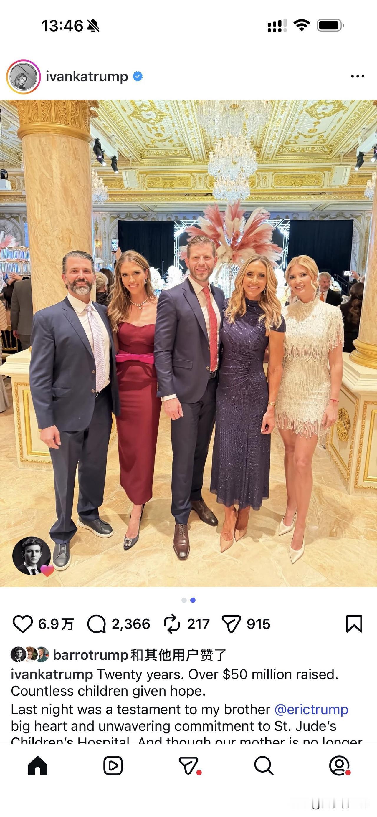 美國「第一公主」身著母親之前的衣服,和她的兄弟們一起。美国第一家庭 Twenty years. Over $50 million raised. Countless children given hope.✨ Last night was a testament to my brother erictrump big heart and unwavering commitment to St. Jude's Children's Hospital. And though our mother is no longer with us, her spirit filled the room... I felt her especially close, wearing a dress that once belonged to her. Mom would have been so proud of you baby brother! Legacy isn't just what we build, but the love we carry forward.💕