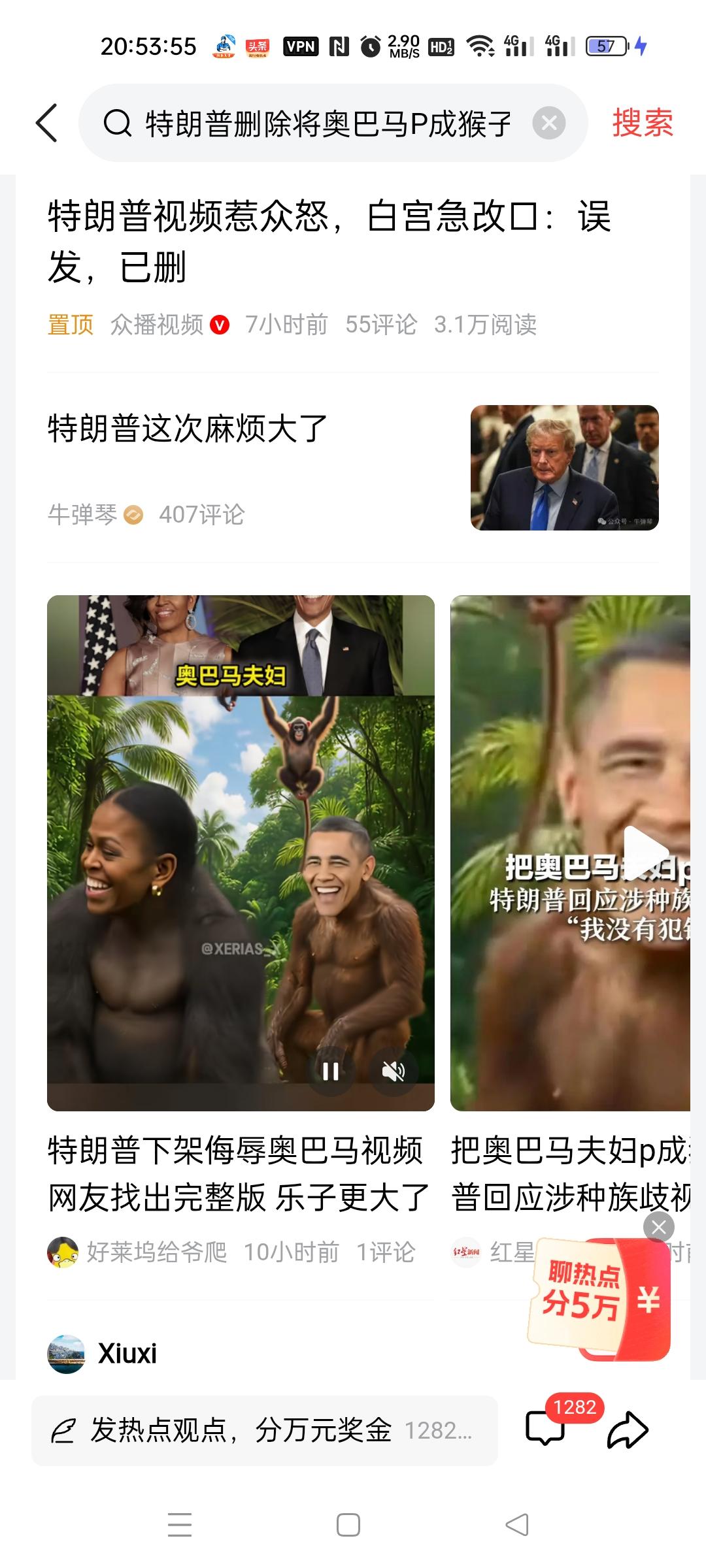 特朗普总统发奥巴马夫妇p成大猩猩等视频遭批后删除… 5日,美国总统特朗普在自己的社交网站(SNS)上发了段视频,把前总统奥巴马和他老婆米歇尔比作类人。这事儿不光民主党看不惯,就连他自个儿共和党这边的亲人都指责这是“种族歧视”。这视频6号就被删了,白宫解释说是“职员传错了”。 在美国,以前搞奴隶制、种族隔离政策,把对黑人的歧视合理化的时候,就老用把黑人比作猴子这种说法。 发布的视频里,特朗普在控诉2020年美国总统选举不公,说自己落选这事有猫腻。到最后,画面突然一变,出现丛林场景,还配上音乐,奥巴马夫妇的脸和大猩猩、猩猩这类动物的画面重叠在一起。
