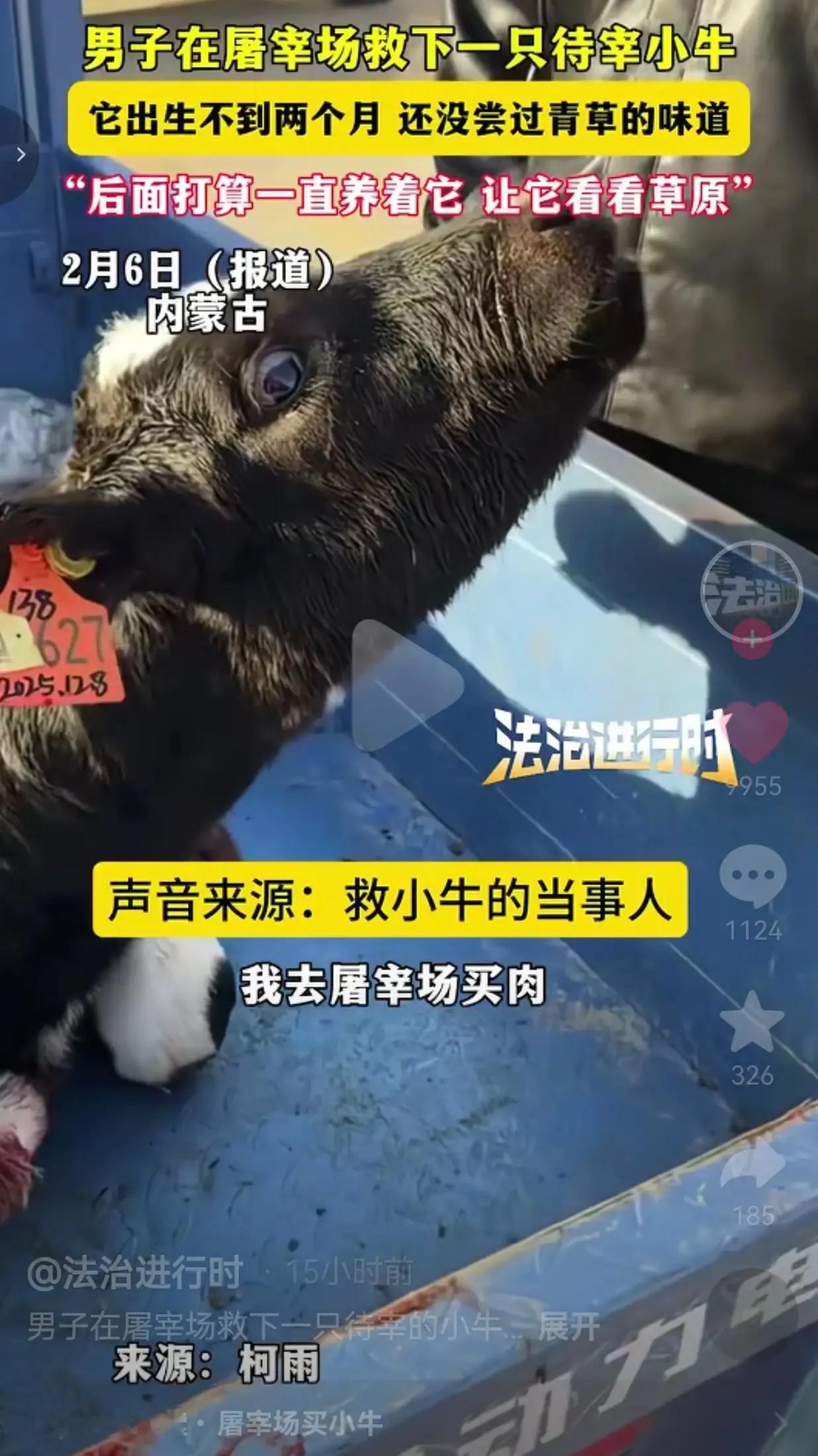 近日,内蒙古,一男子本来是去屠宰场买肉的,结果在屠宰场看见一头小黑牛。只见它蜷缩在冰冷的屠宰车间里,瑟瑟发抖,眼睛里全是惊恐,好像它知道自己的命运似的。 男子走近了才看见它耳朵上的耳标,上面清清楚楚写着出生日期:2025年12月8号。 算下来,这只小牛出生还不到两个月,连青草是什么味道都没尝过,就要被送上屠宰台。男子的心像被什么揪了一下,他蹲下来,试着伸手摸了摸小牛的头。小家伙起初吓得往后缩,后来似乎感受到了善意,轻轻蹭了蹭他的掌心,湿漉漉的眼睛里还挂着泪。 男子当场就改了主意,他没买肉,而是跟屠宰场的人商量,想把这只小牛买下来。对方一开始还觉得奇怪,说这牛太小,肉也没多少,不划算。但男子态度很坚决,说自己不是要吃肉,就是想让它活下去。最后,他按市场价付了钱,把小牛抱上了自己的车。 车开在回家的路上,小牛一开始还很不安,后来慢慢放松下来,靠在车厢里睡着了。男子从后视镜里看着它,心里五味杂陈。他想起自己小时候在乡下见过的牛,都是在草地上慢悠悠地吃草,晒着太阳,而这只小牛,从出生到现在,连一天自由的日子都没过过。 回到家后,男子给小牛搭了个温暖的小窝,喂它喝温水、吃软嫩的草料。小家伙渐渐活泼起来,会跟着他的脚步走,会用头蹭他的手。男子说,他打算一直养着这只小牛,等天气暖和了,就带它去真正的草原,让它尝尝青草的味道,看看风吹草低见牛羊的样子。 这件事在网上传开后,有人说男子太感性,也有人说他做了一件很有意义的事。其实,我们每天都在吃肉,这是生活的一部分,但这不代表我们可以对生命的痛苦视而不见。屠宰场是冰冷的,但人心可以是暖的。当我们看到一个弱小的生命在恐惧中挣扎时,选择伸出手,而不是转过头,这本身就是一种对生命的尊重。 我们总说要敬畏自然,敬畏生命,但敬畏不是一句口号,而是体现在每一个具体的选择里。男子救下的不只是一只小牛,更是我们对生命最朴素的共情。这种共情,不应该只出现在新闻里,更应该藏在我们日常的每一次思考和行动中。 各位读者你们怎么看?欢迎在评论区讨论。