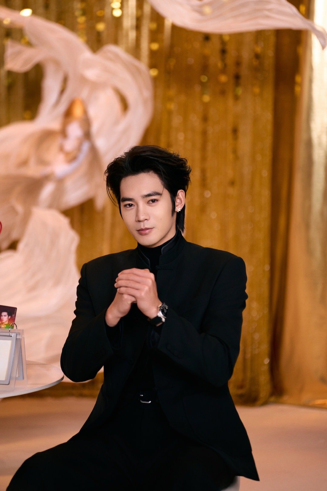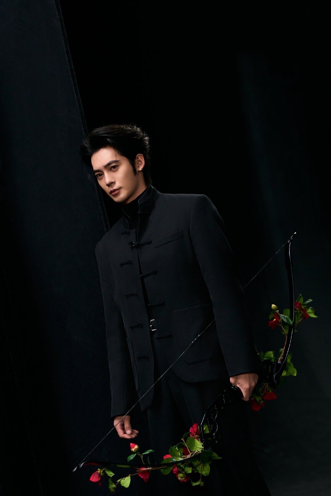 于适|今日品牌活动造型出图,身穿黑色盘扣立领新中式套装,佩戴浪琴腕表,all b