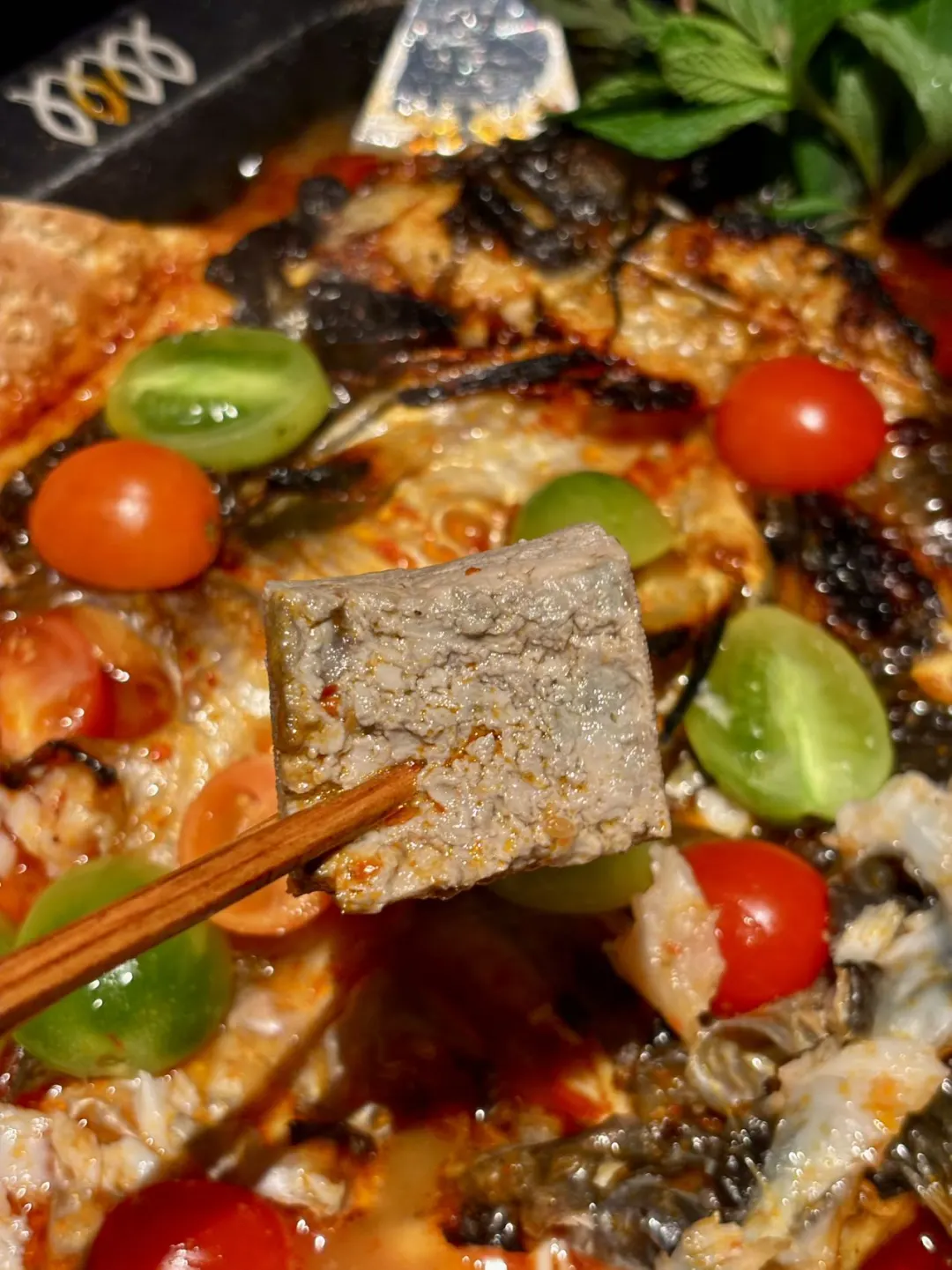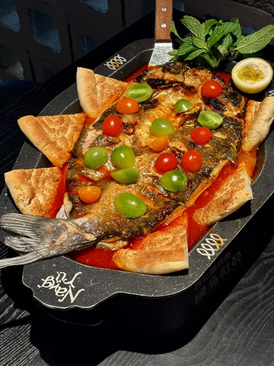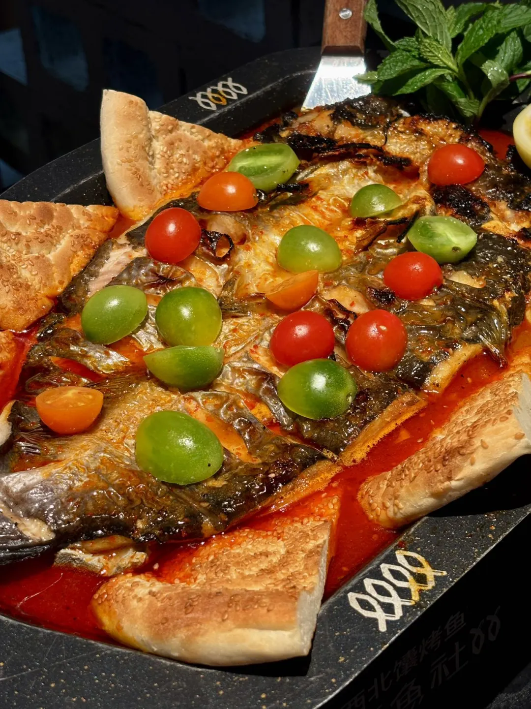 南京近期热度最高的烤鱼非馕鱼社莫属,这个搭配让我对其有天然的亲切,我也算是听着“五饼二鱼”故事长大的孩子了,默认🐟➕🫓就是绝配! 番茄🍅酸汤烤鱼 汤底是云贵酸汤味的,很是开胃🤤,鱼皮焦香鱼肉细嫩入味,吃一口就停不下来。馕酥脆蓬松,蘸汤汁超级美味,蛋白质配碳水的快乐真是没谁了! 颗颗🌽玉米粒 炸得金灿灿的,一看就很有食欲,真的是颗颗分明,香甜酥脆,老少皆宜。 苹果🍎气泡水 酸甜解腻,冰凉沁爽,带着淡淡的苹果香气,我愿称之为“自由意志之水”。