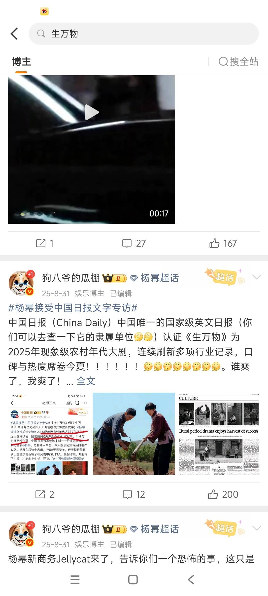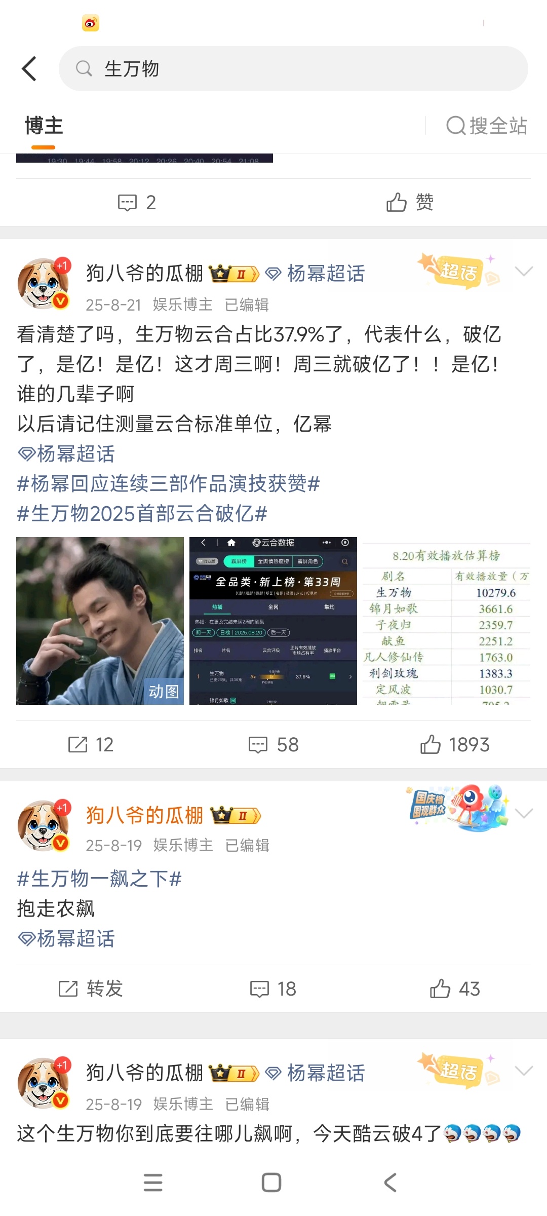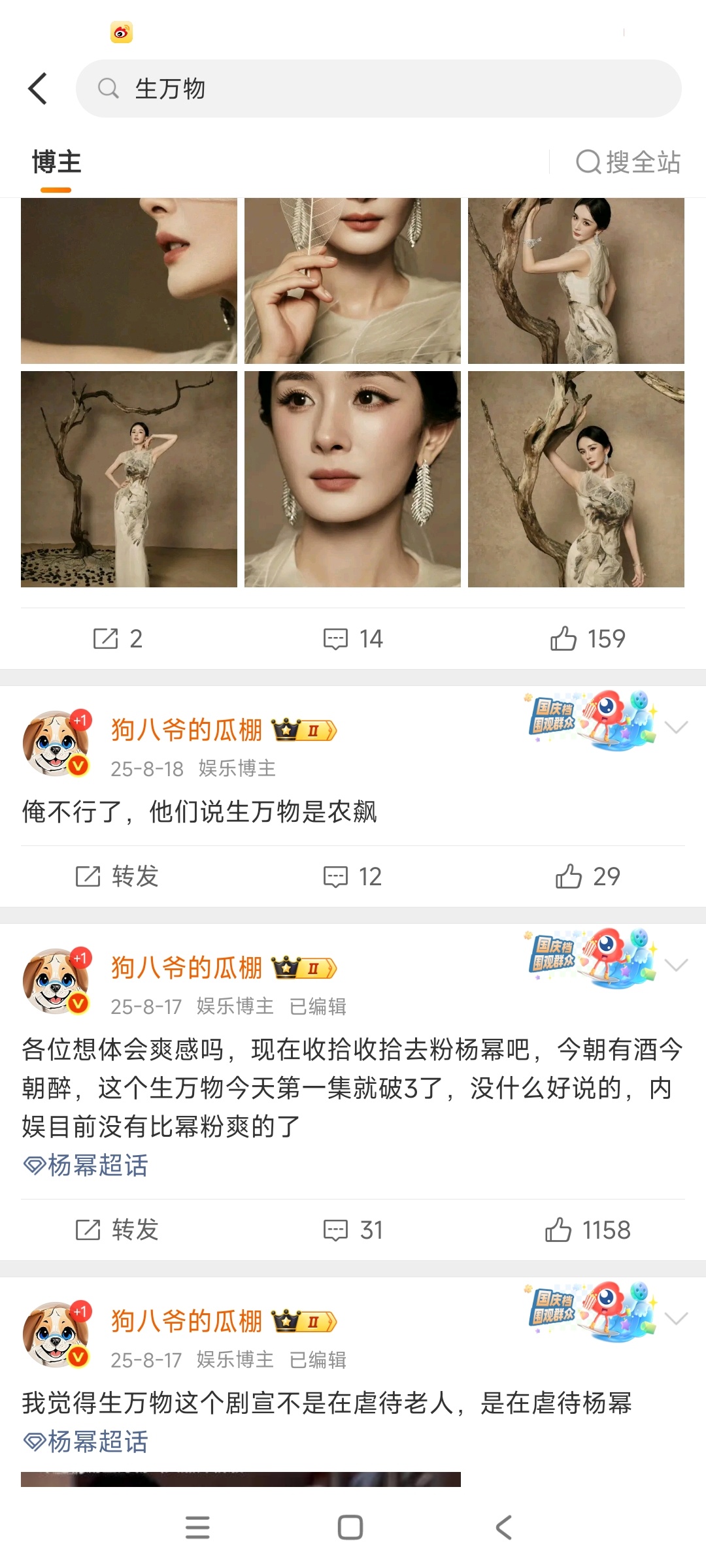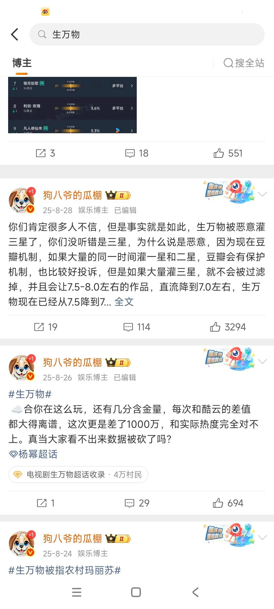 昨天生万物被打一⭐的时候,我是真的怒了。关注我的都知道,我是真的一步步追生万物过来的,见证的一部爆剧的诞生,作品好不好看过的心理清楚,结果因为一个堂会,因为f圈纷争就肆意践踏那么多人的心血?我不是因为讨厌一个人站杨幂,我是因为公道自在人心站的杨幂,我是因为维护公正的yu论环境,站的真理。