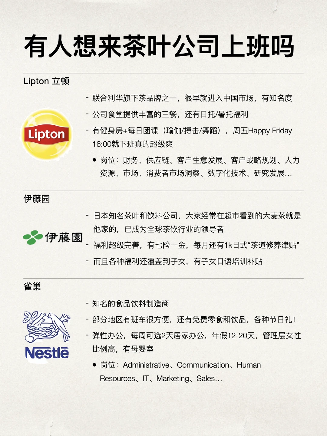 大家可能会觉得茶叶公司听起来有点“传统”,但其实不是的,像三得利、伊甸园这些都是很多年轻人熟悉的品牌,其实都是业务比较成熟的消费品~是很适合年轻人的 很多岗位都在研发、市场、质量管理、供应链这些方向。节奏稳定,对女生也很友好。大部分都是955作息、年假15天以上、节日福利齐全,稳定感和幸福感很强 如果你是农学、食品、生物类专业,或者单纯喜欢茶、喜欢自然,想找一份节奏舒服的工作,那茶叶外企真的可以去试试 坚持日更✊🏻,对外企感兴趣的欢迎常来看看