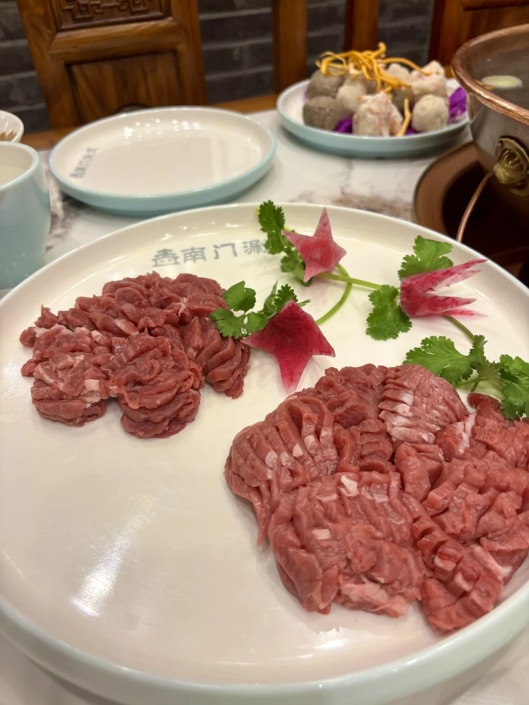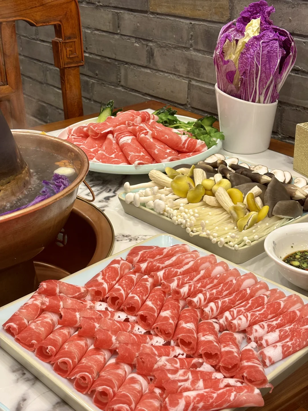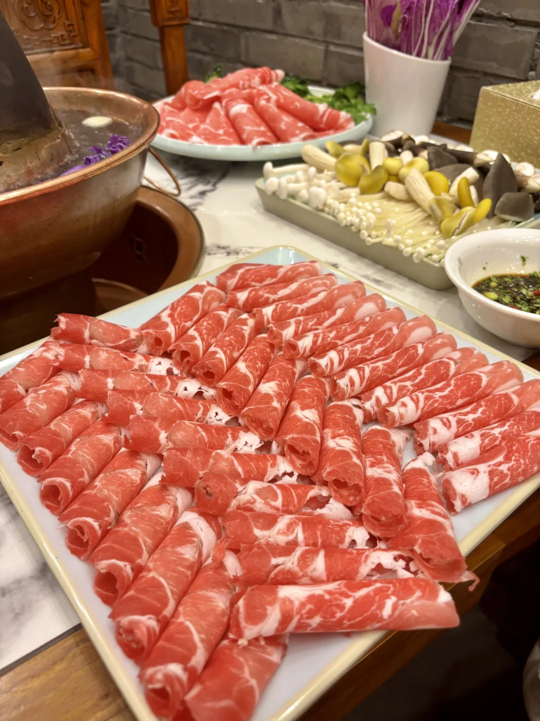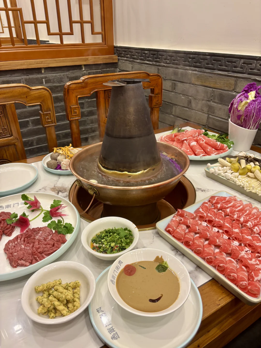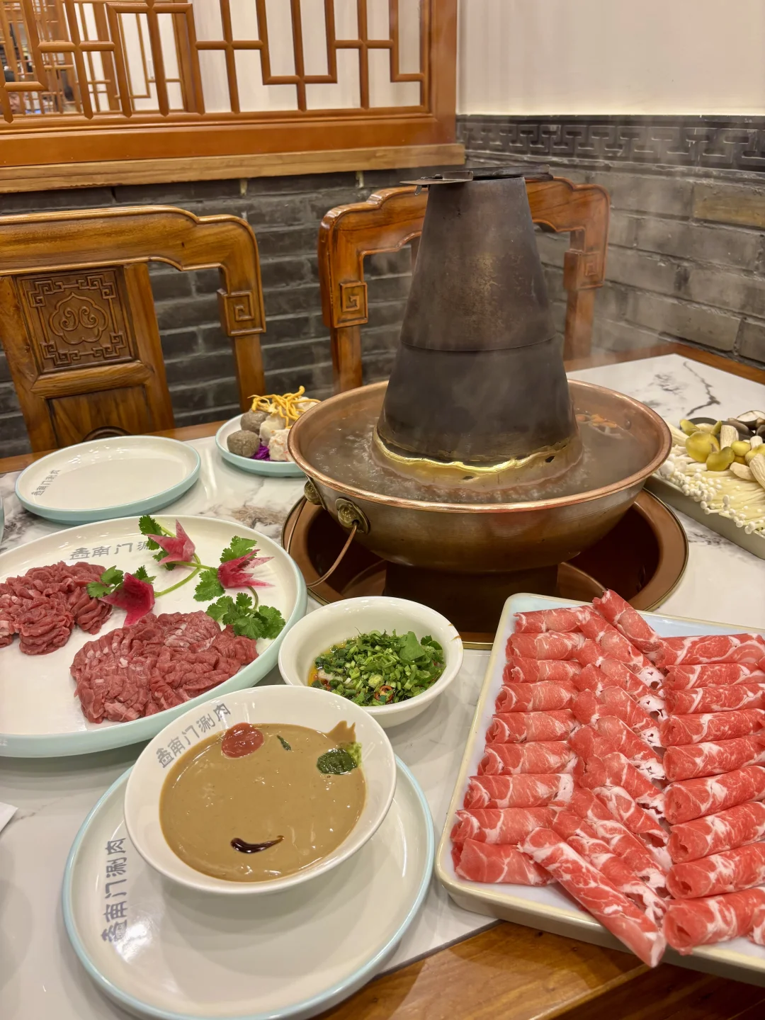 在亚运村想吃老北京铜锅 冲了南门铜锅涮肉! 寒冬里这口沸腾的铜锅太治愈 进店满是老北京烟火气 传统炭火铜锅 清水锅底只加姜片、葱段 完美还原老北京涮肉的精髓。 必点手切羊上脑!师傅刀工超赞,肉片薄厚均匀,立盘不倒 蘸上店里的秘制麻酱,醇厚的酱香裹着羊肉的鲜,一口下去超满足。 还有精选肥牛卷,纹理漂亮,涮煮后入口丝滑,油脂香气十足 搭配酸菜或糖蒜,解腻又提味。 冬天围着铜锅,吃着鲜羊肉,喝着热汤,浑身都暖透了,已经把这家列入冬日涮肉清单,下次还要带家人来尝~