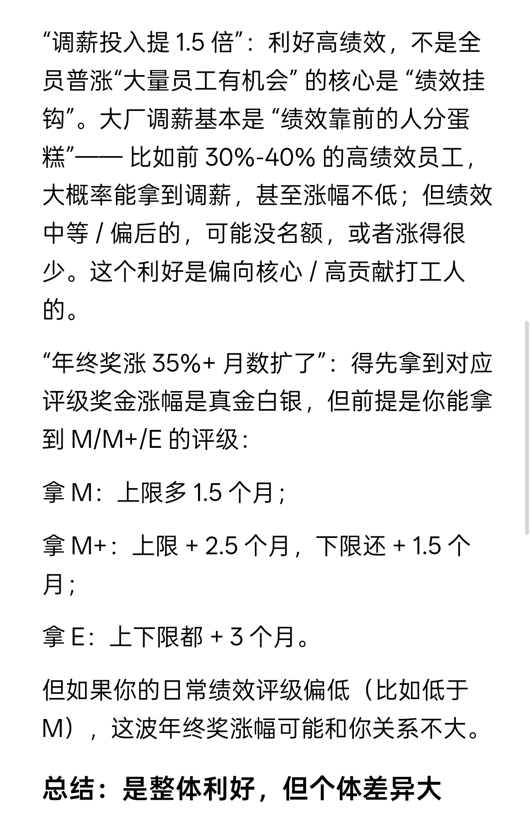 但如果你的日常绩效评级偏低(比如低于 M),这波年终奖涨幅可能和你关系不大。